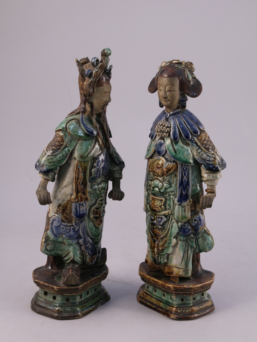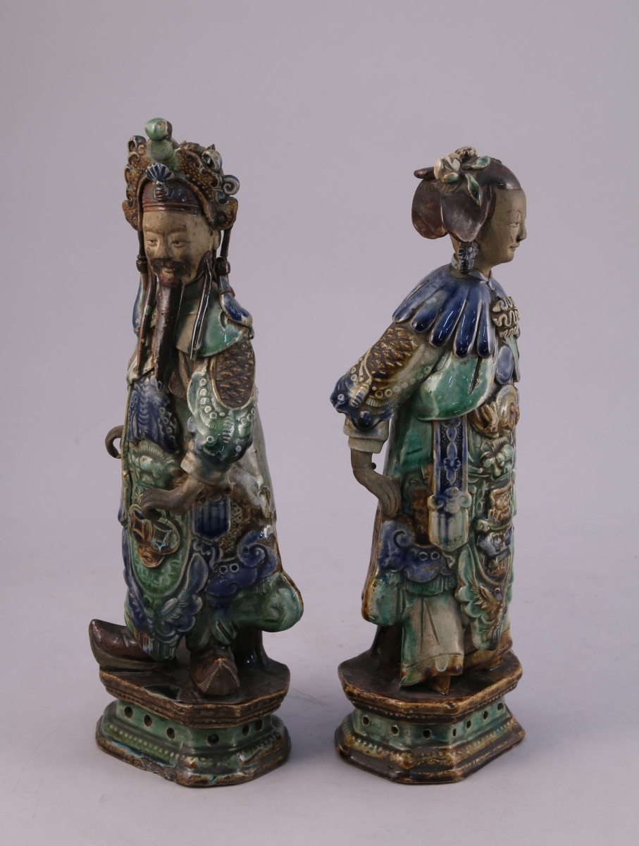 CHINE - SHIWAN - fin XIXe. Deux PERSONNAGES formant un couple en grès vernissé.