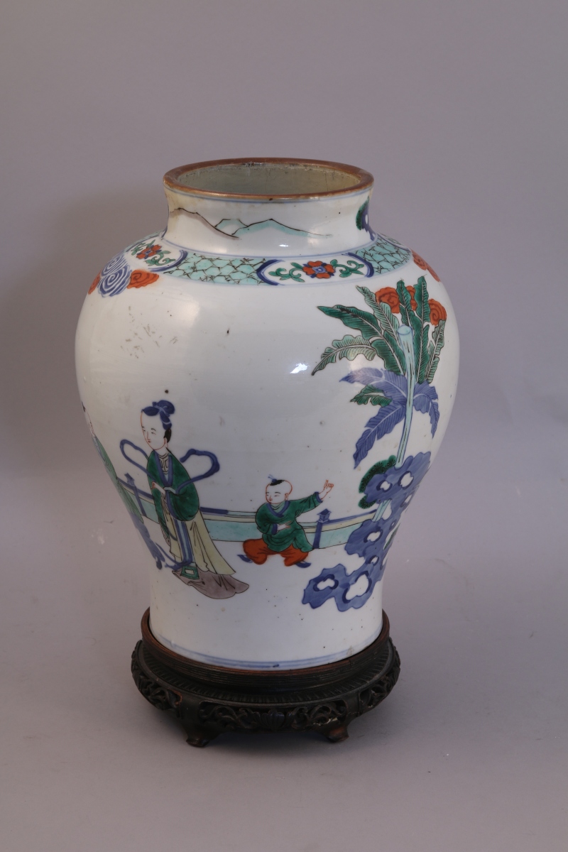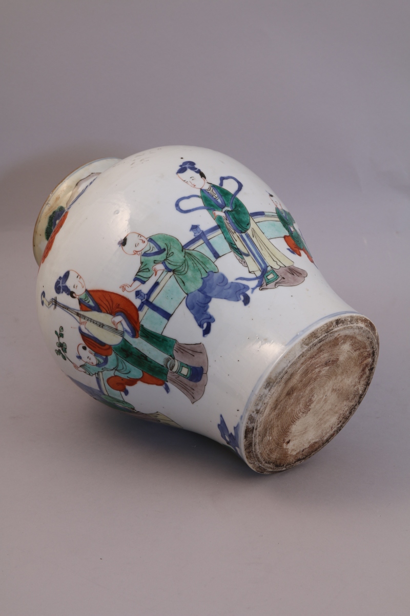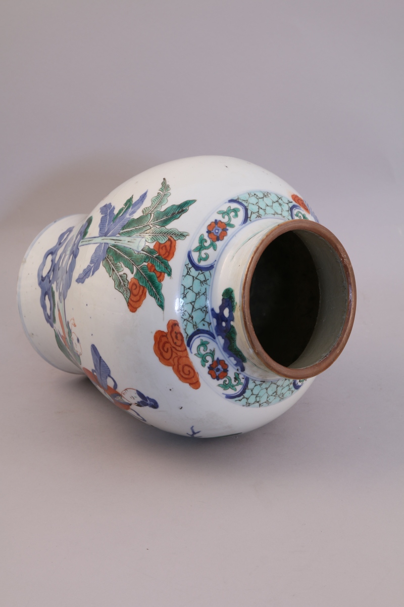 CHINE - XIXe. VASE balustre en porcelaine à décor polychrome rayonnant d'une scène de palais.
