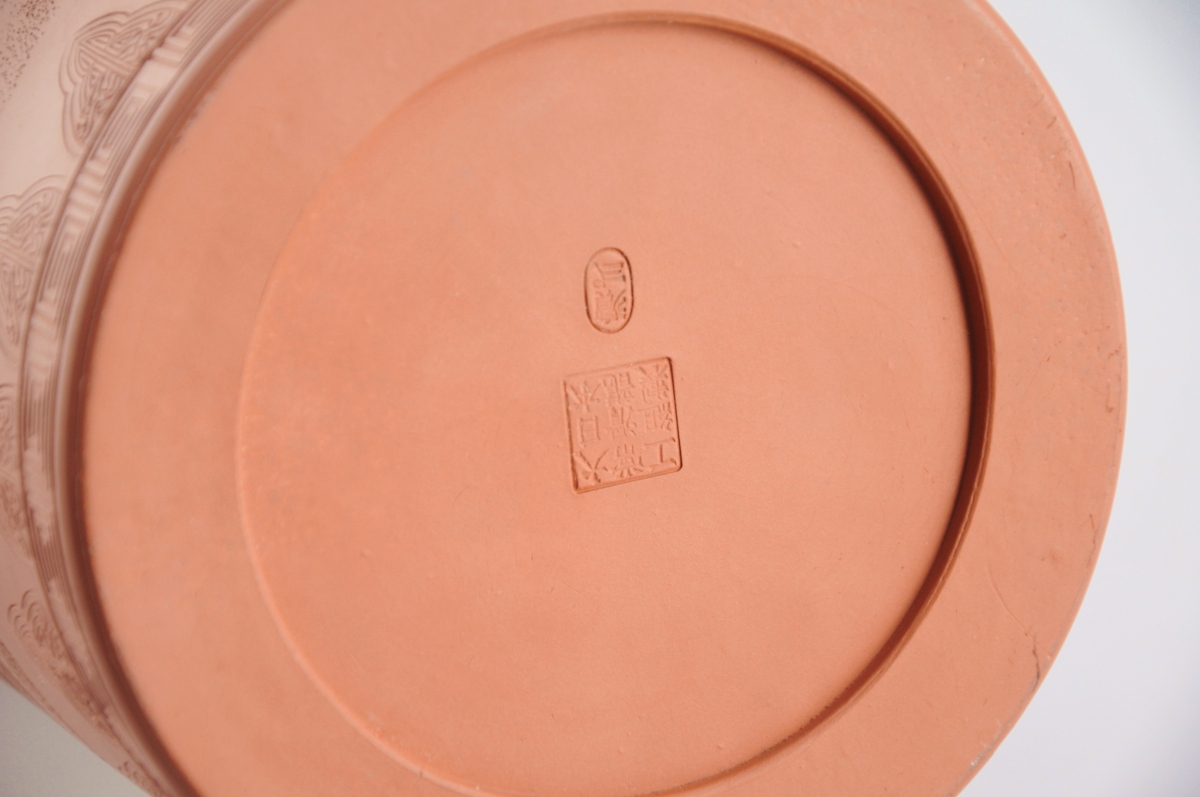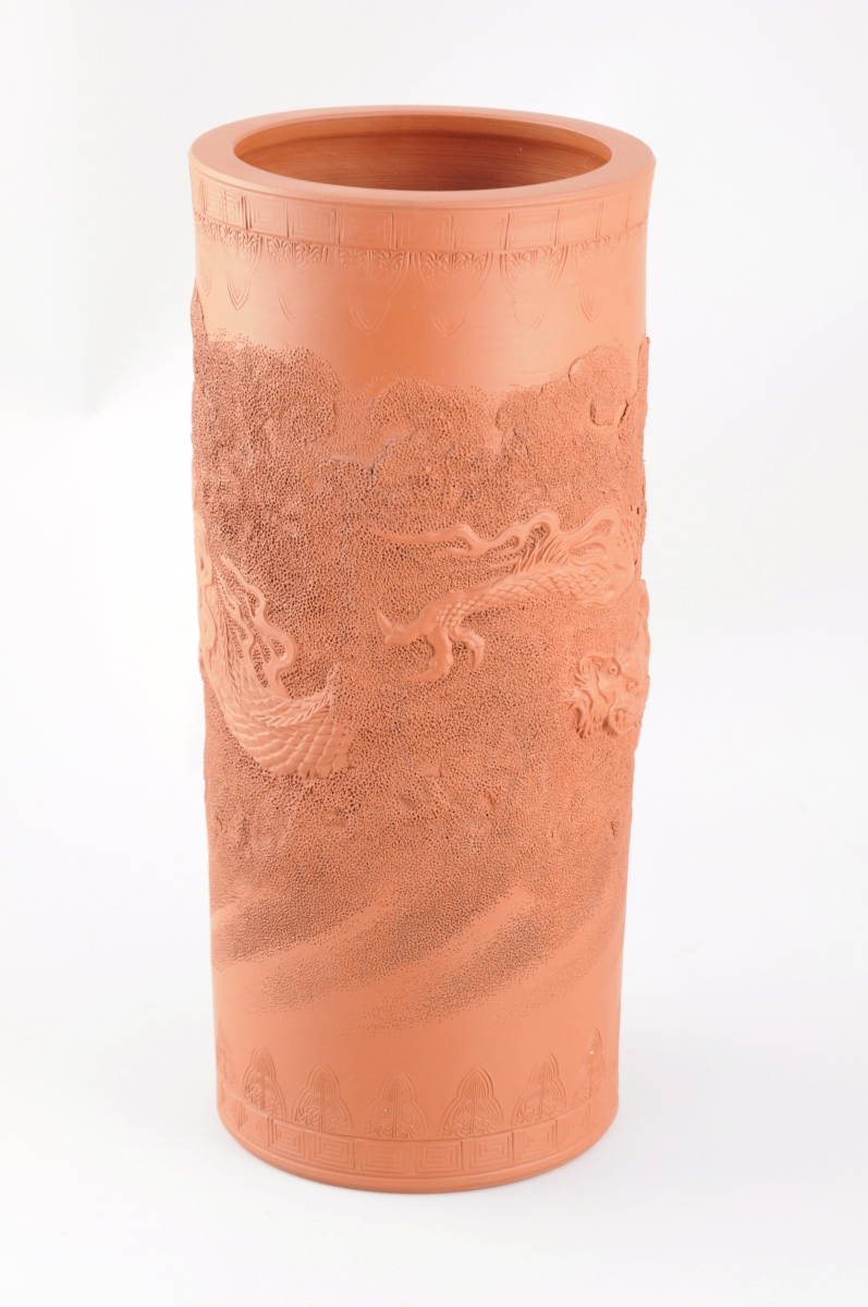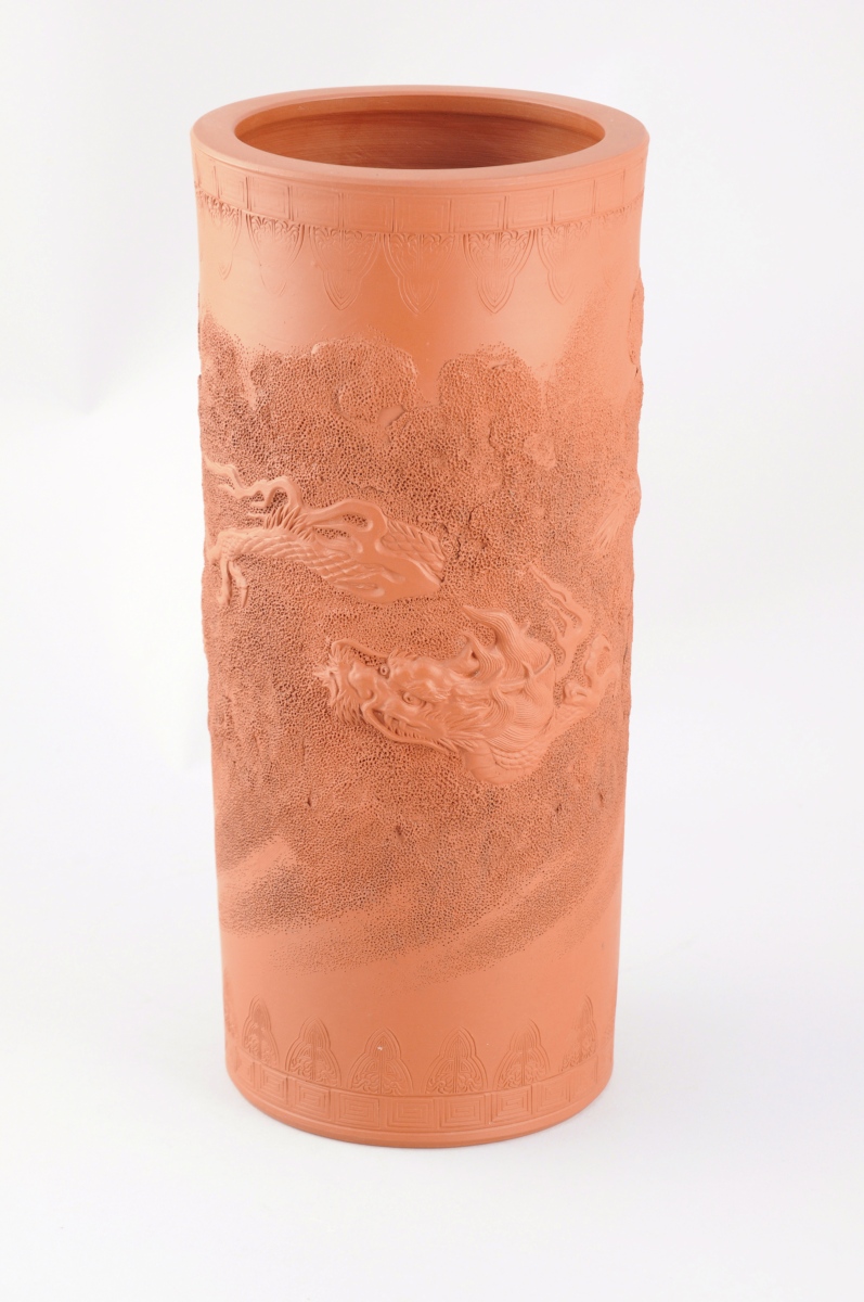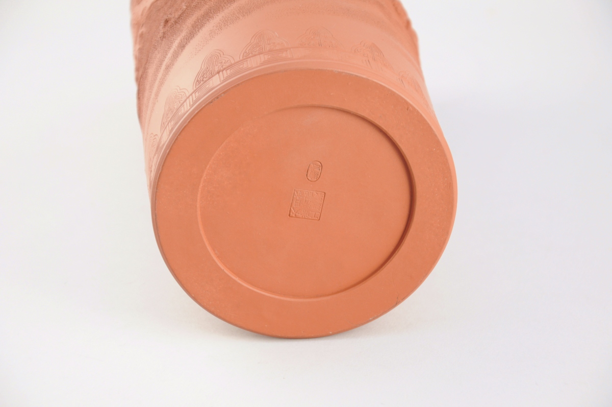 CHINE - YIXING. VASE rouleau en grès de YIXING orné en bas-relief d'un dragon serpentant dans des nuées. Cachets.