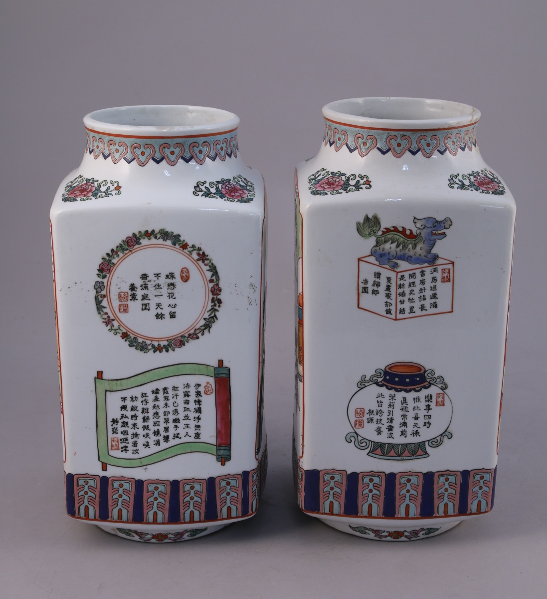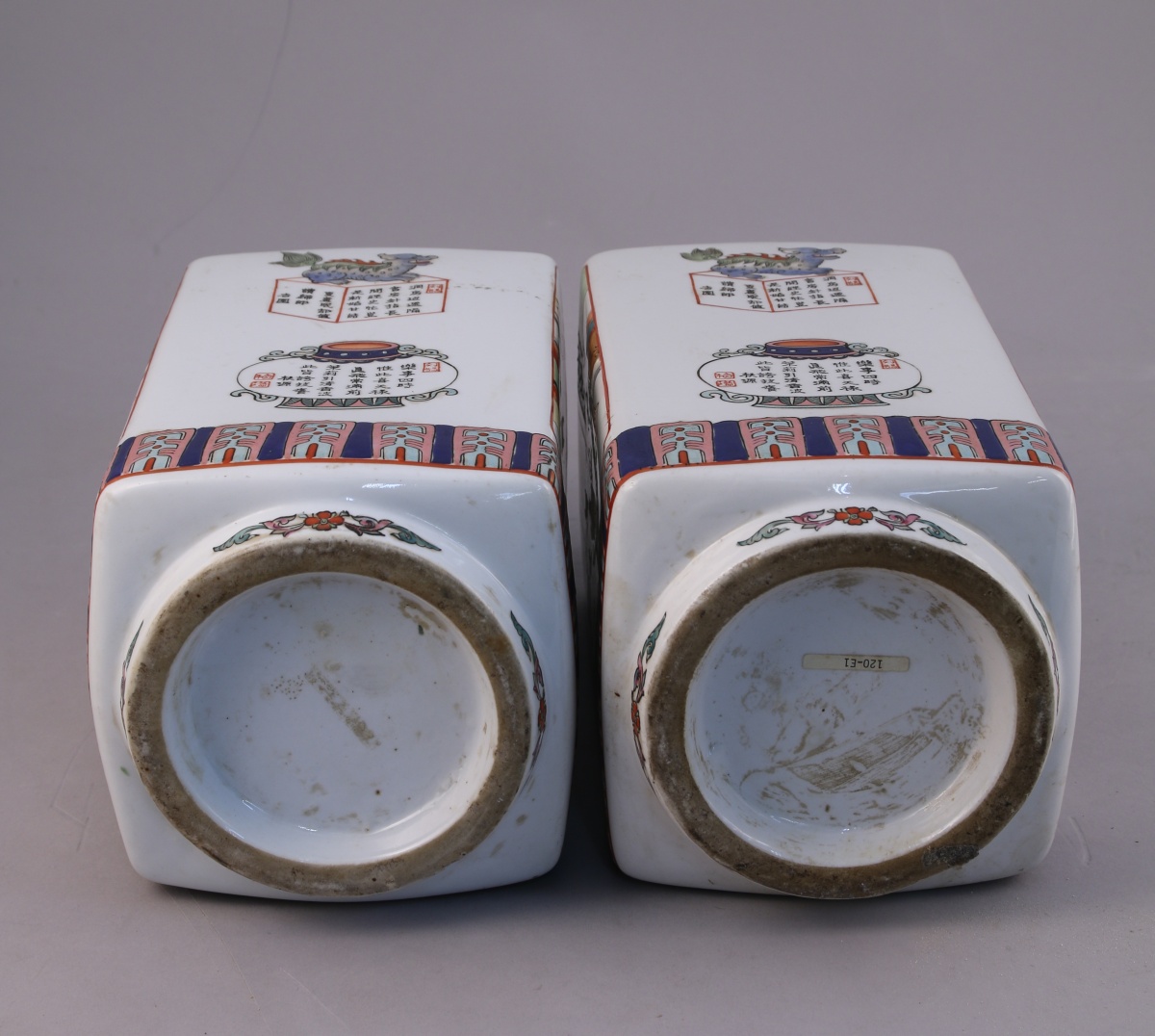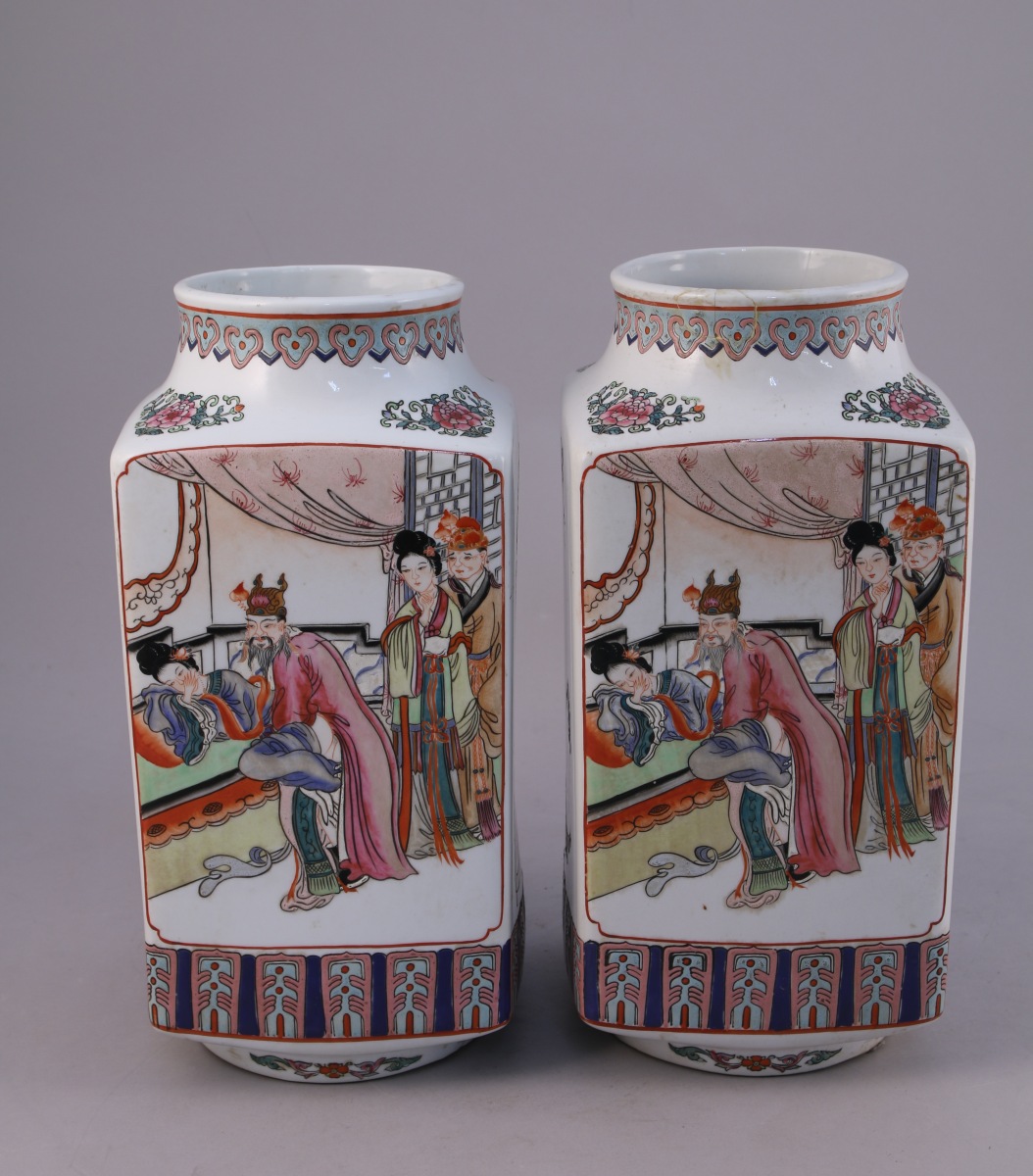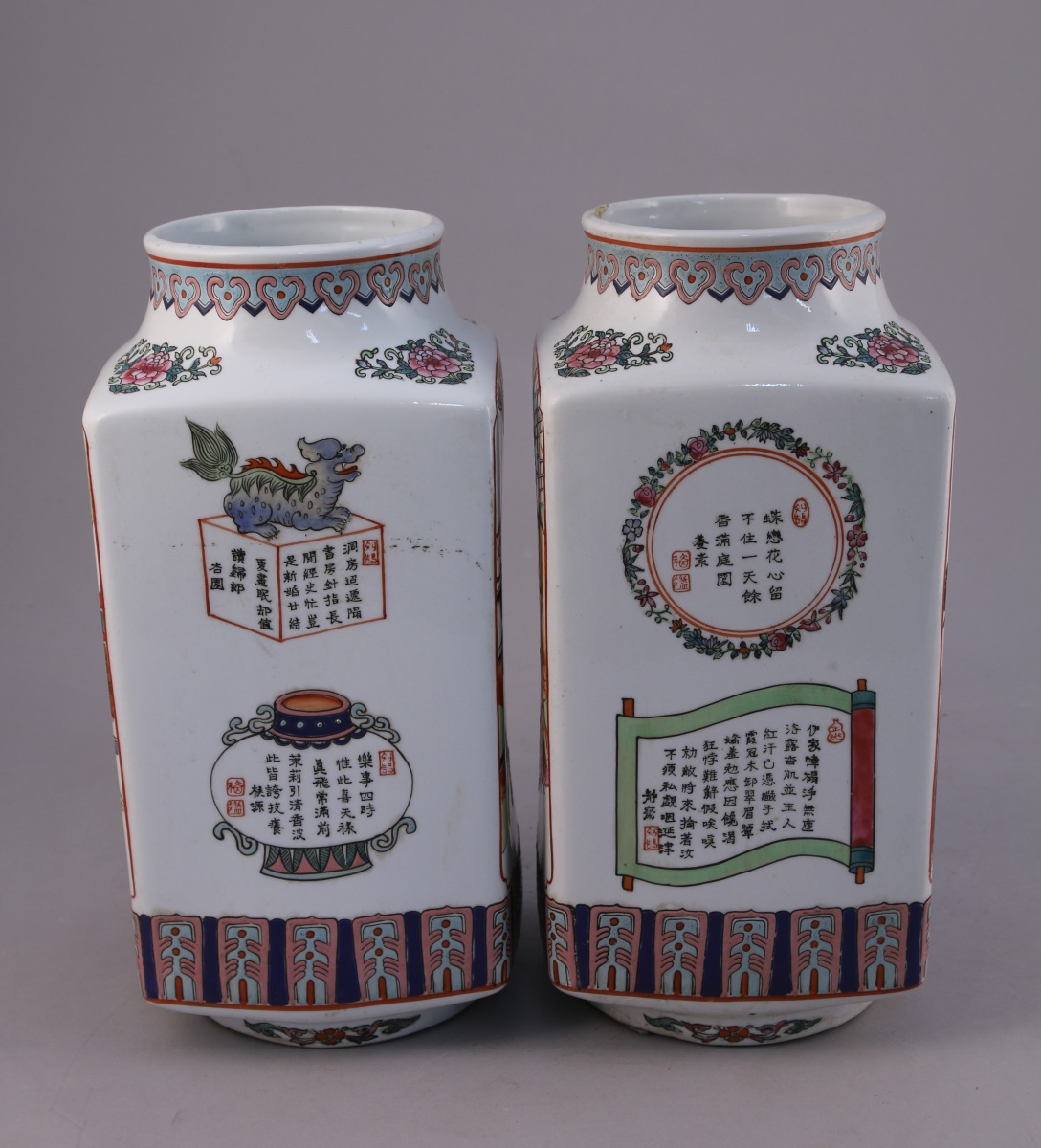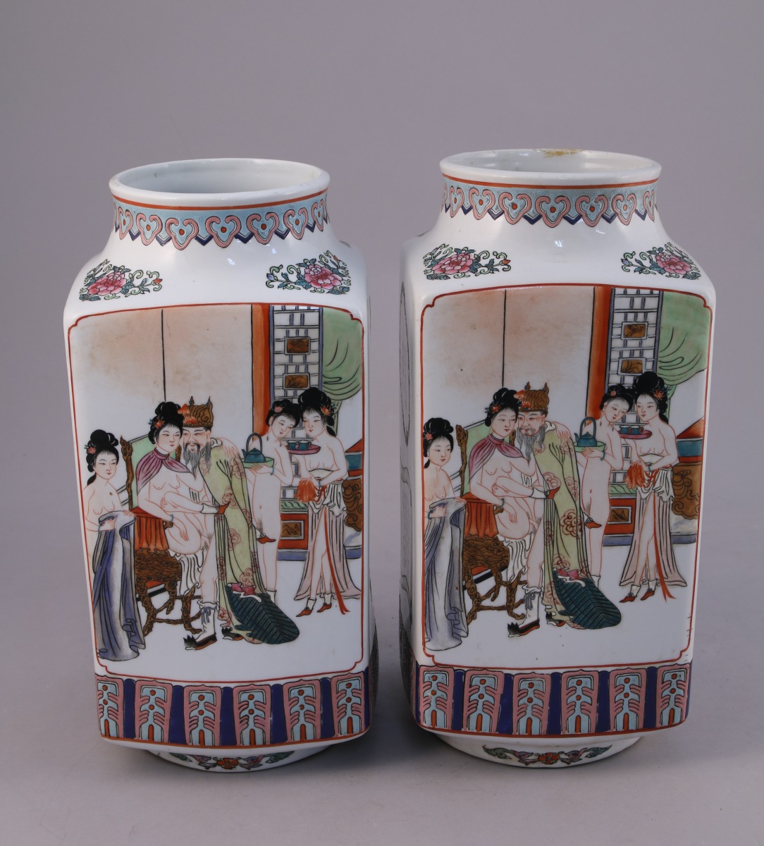 CHINE - XXe. Paire de VASES à section carrée en porcelaine à décor érotique.