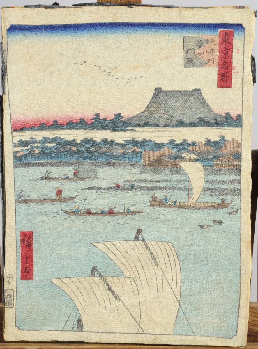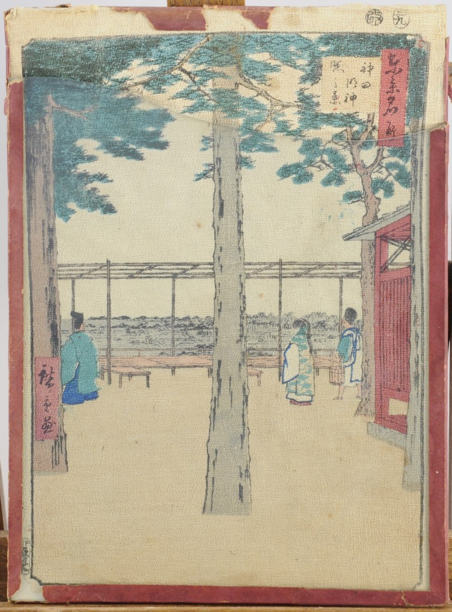 HIROSHIGE. TROIS ESTAMPES : Pont, Personnages sous un pin et Vue de Tokyo.