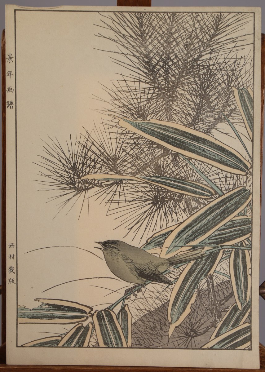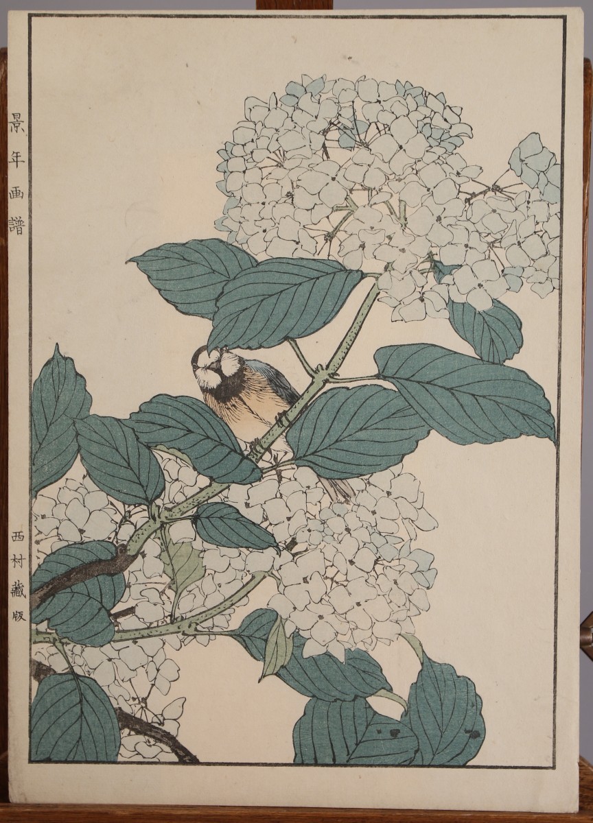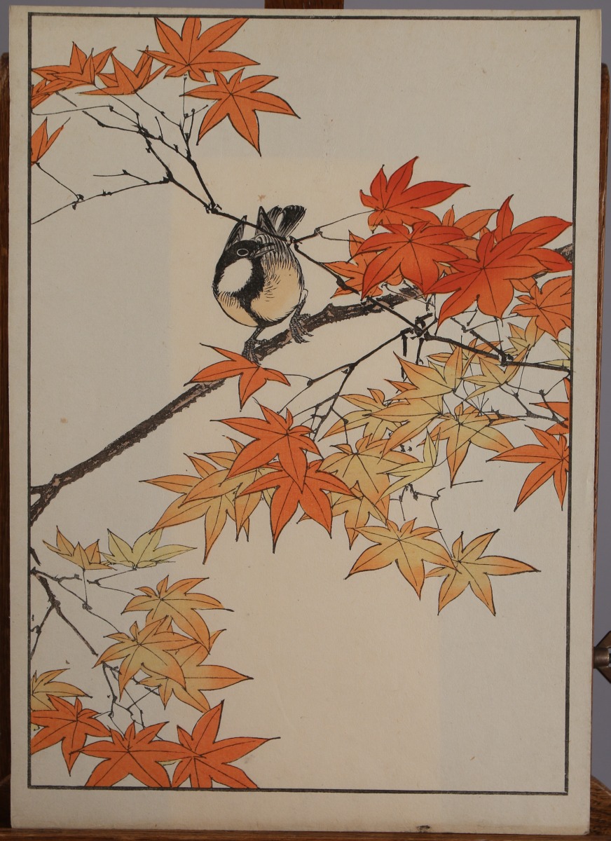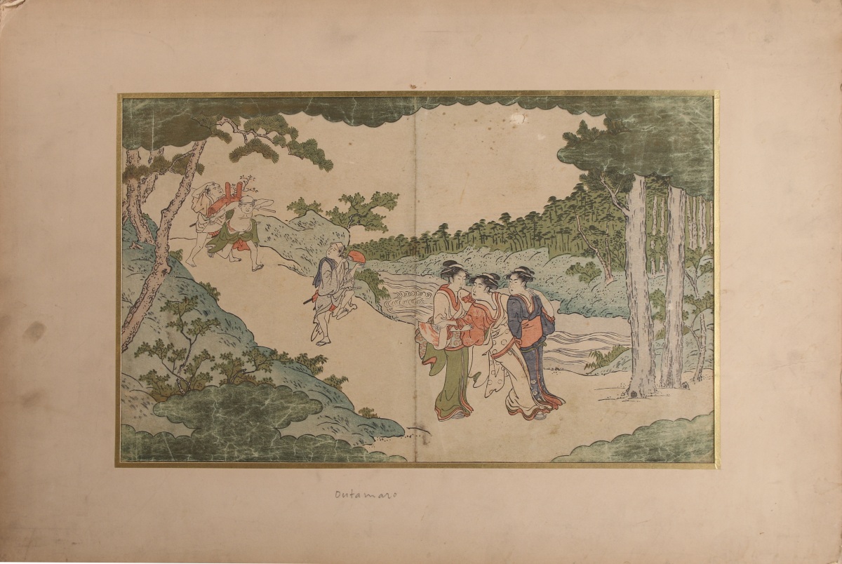 RÉUNION de NEUF ESTAMPES par différents artistes, dont un oban par Toyokuni III, une double page par Utamaro représentant des jeunes femmes et colporteurs, quatre pages d'album par Imao Keinen, un chuban par Hiroshige représentant un oiseau et un oban retirage d'après Hokusai, planche Eijiri de la série des 36 vues du Mont Fuji.