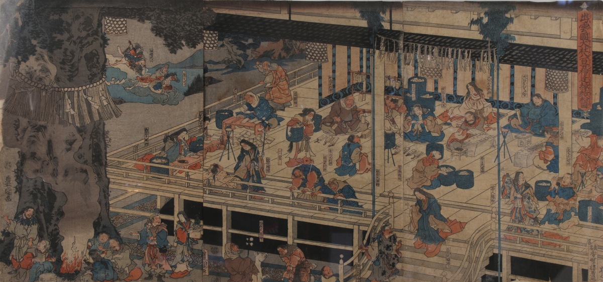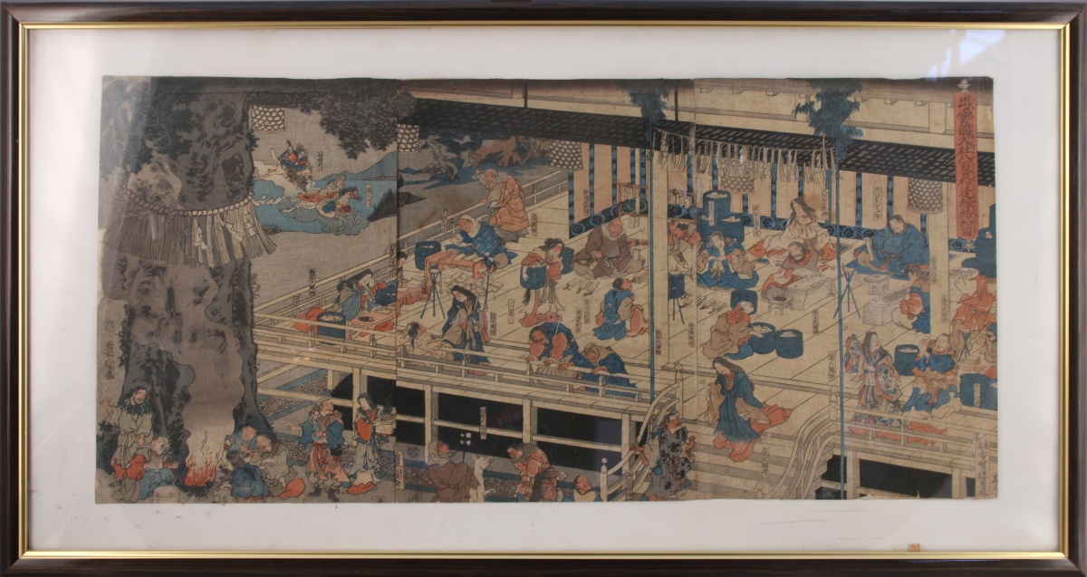 JAPON - XIXe. ESTAMPE polychrome en trois feuillets, figurant un atelier de calligraphie.
