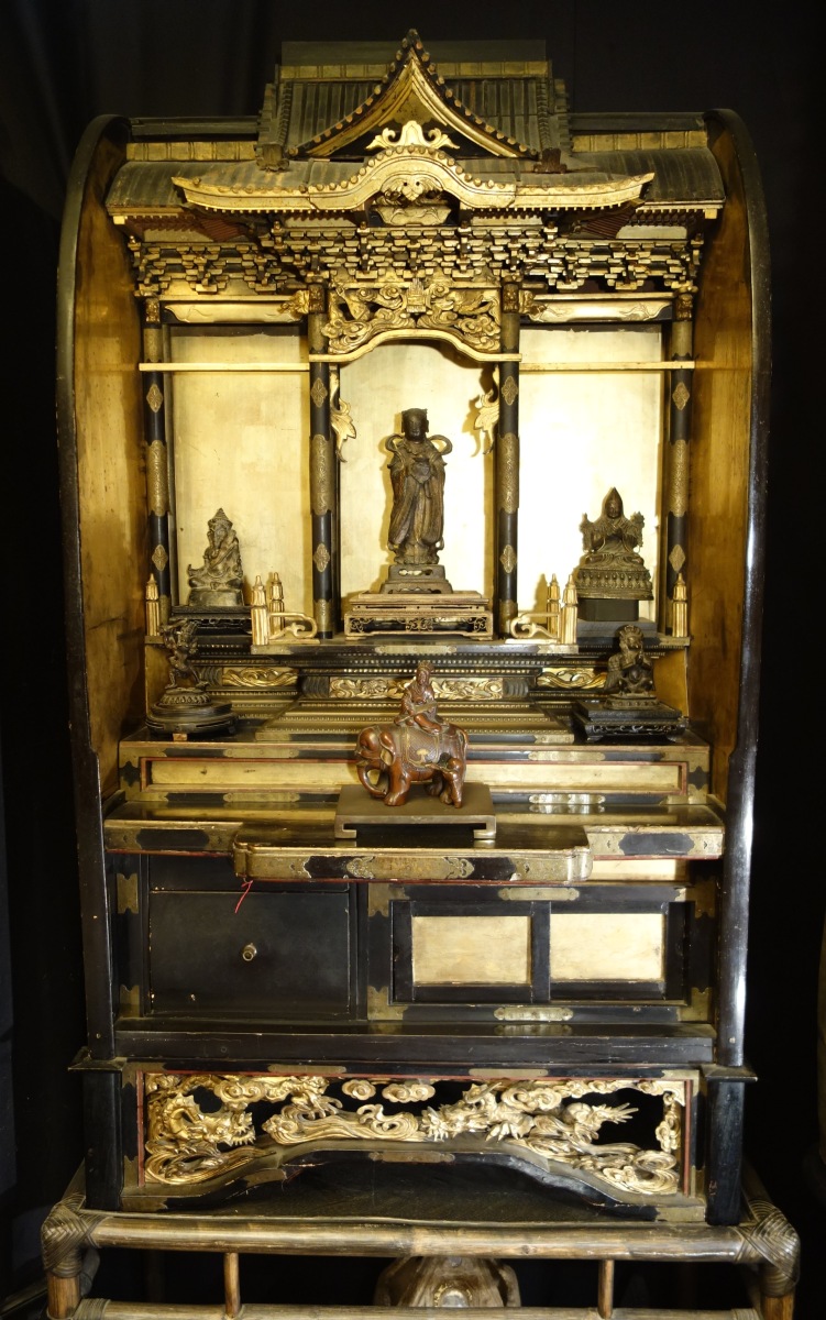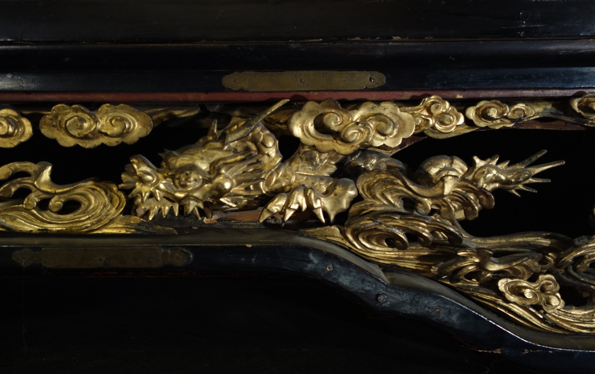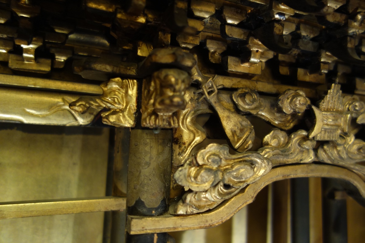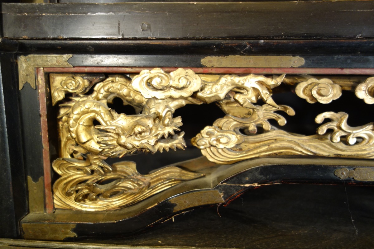 JAPON - XIXe. IMORTANT AUTEL DOMESTIQUE en bois doré à la feuille d'or et bois noir. La niche centrale surmontée d'un toit en forme de pagode, et divisé en trois parties soutenues par des colonnes avec de chapiteaux en chimère, éléphant, décor de nuages et instruments de musique. En partie basse, il ouvre par deux tiroirs et deux portes coulissantes. Son piètement orné de dragons affrontés dans les nuages en bois sculpté ajouré et doré. Ornementation de pièces en cuivre gravé de motifs fleuris.