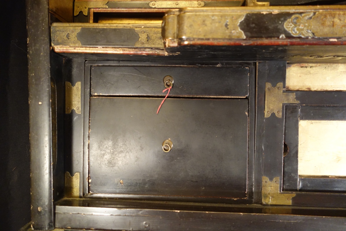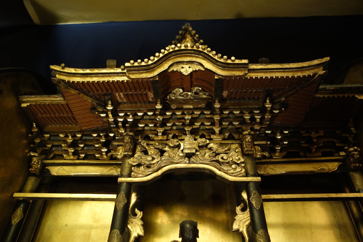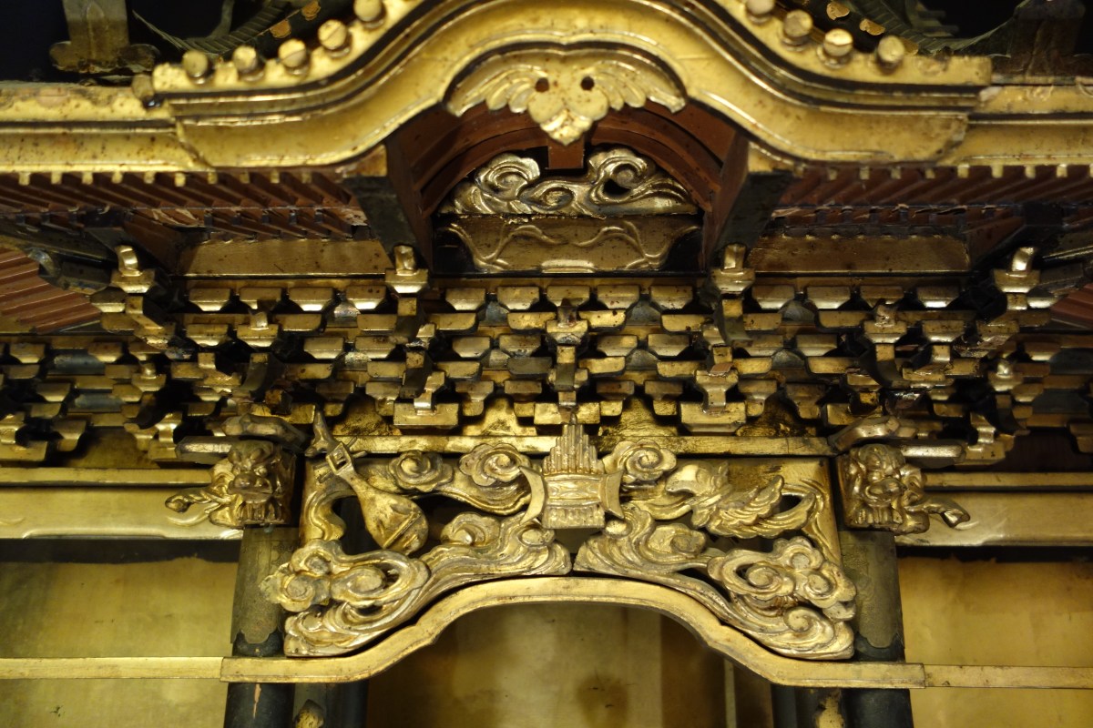 JAPON - XIXe. IMORTANT AUTEL DOMESTIQUE en bois doré à la feuille d'or et bois noir. La niche centrale surmontée d'un toit en forme de pagode, et divisé en trois parties soutenues par des colonnes avec de chapiteaux en chimère, éléphant, décor de nuages et instruments de musique. En partie basse, il ouvre par deux tiroirs et deux portes coulissantes. Son piètement orné de dragons affrontés dans les nuages en bois sculpté ajouré et doré. Ornementation de pièces en cuivre gravé de motifs fleuris.