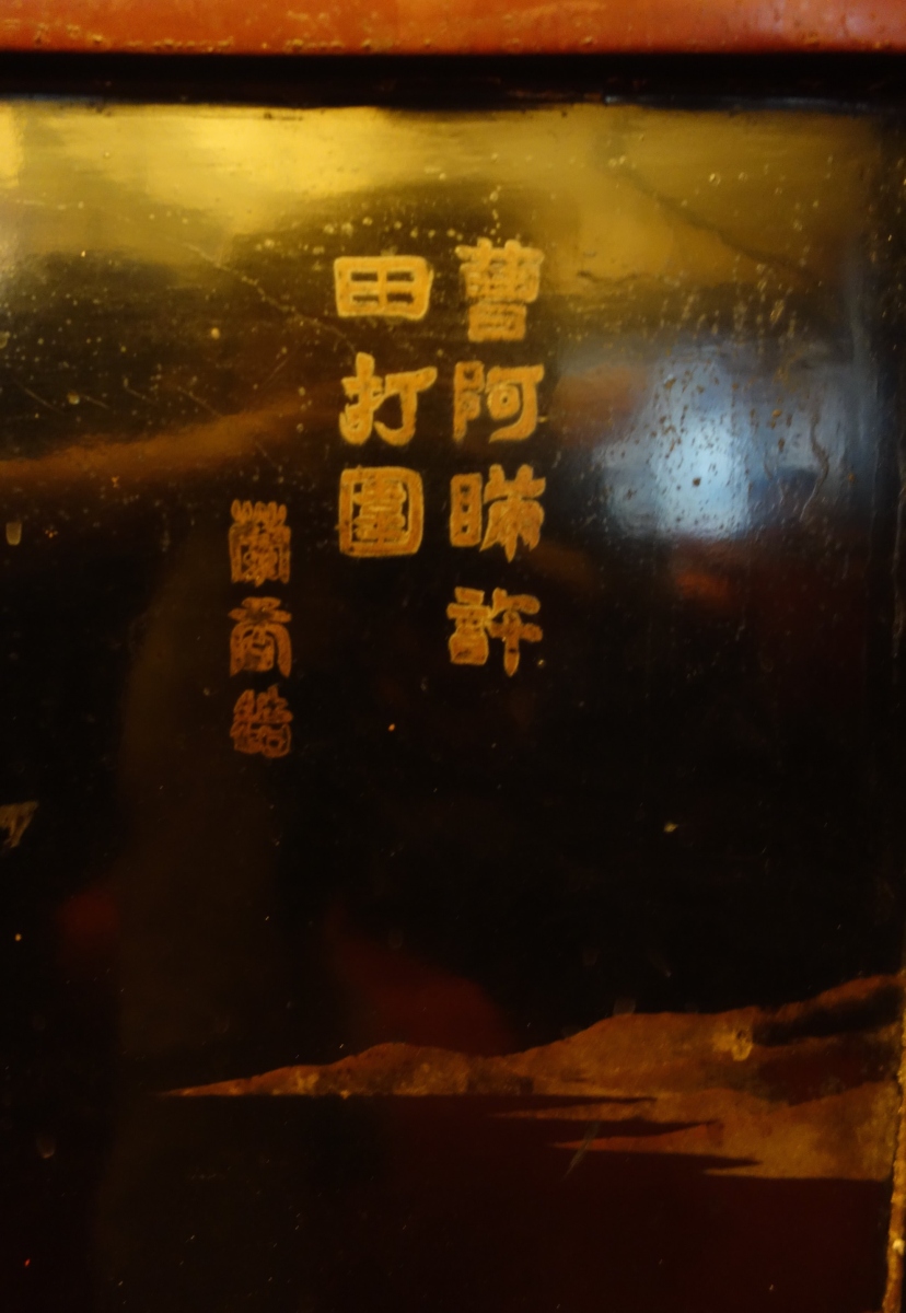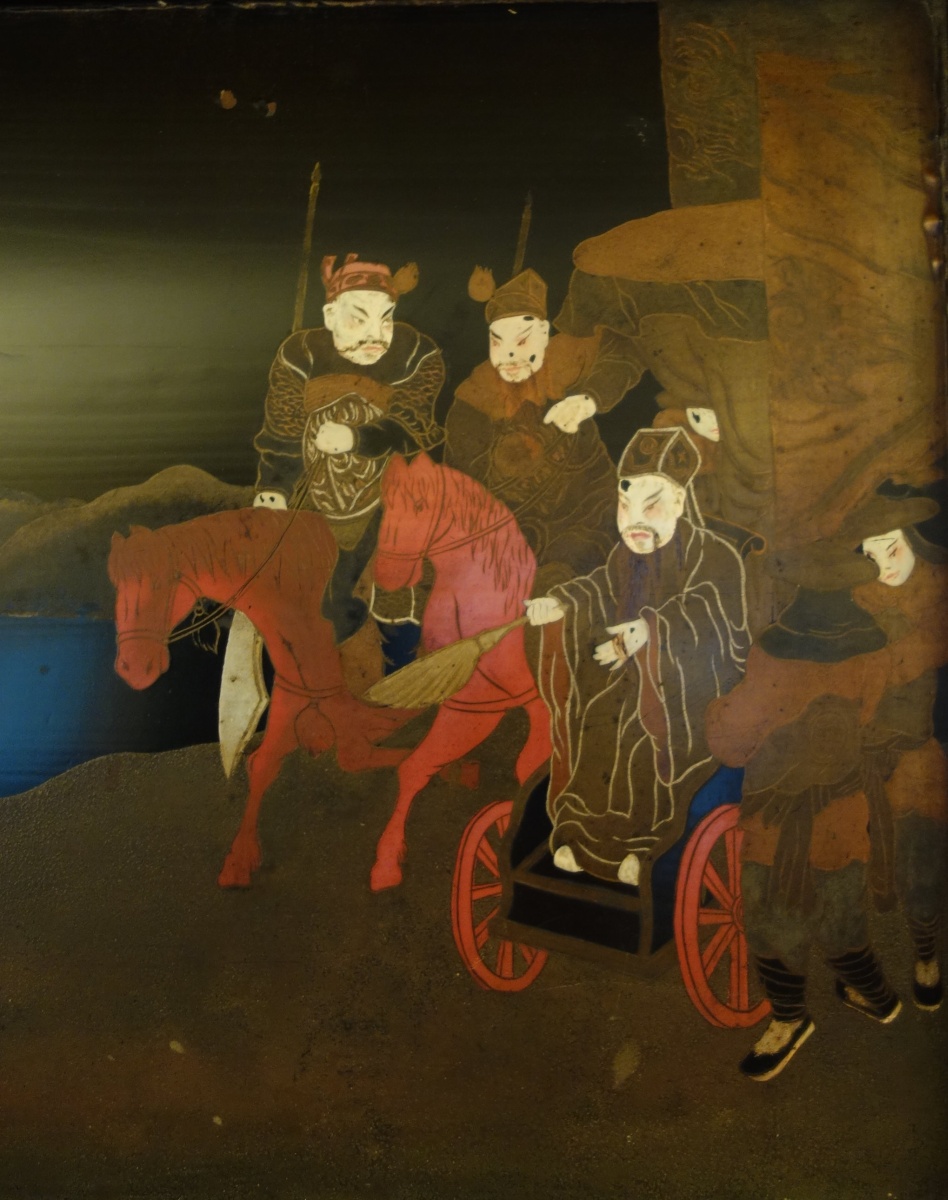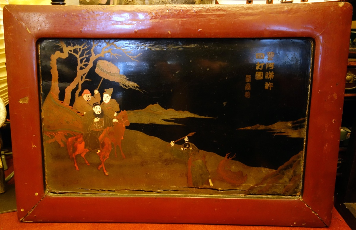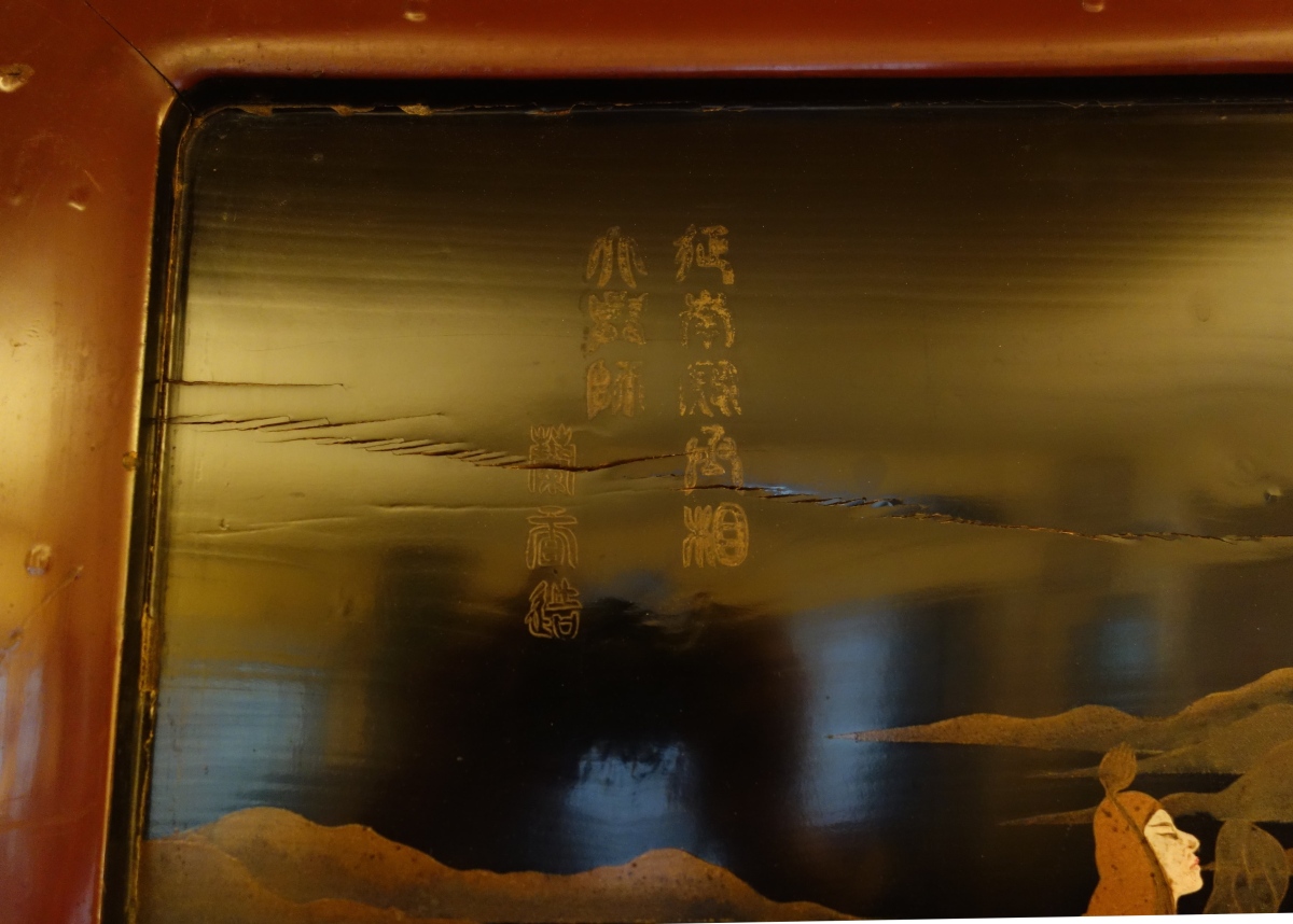 JAPON. Deux PANNEAUX en laque figurant une scène de chasse impériale au cerf. Signé.