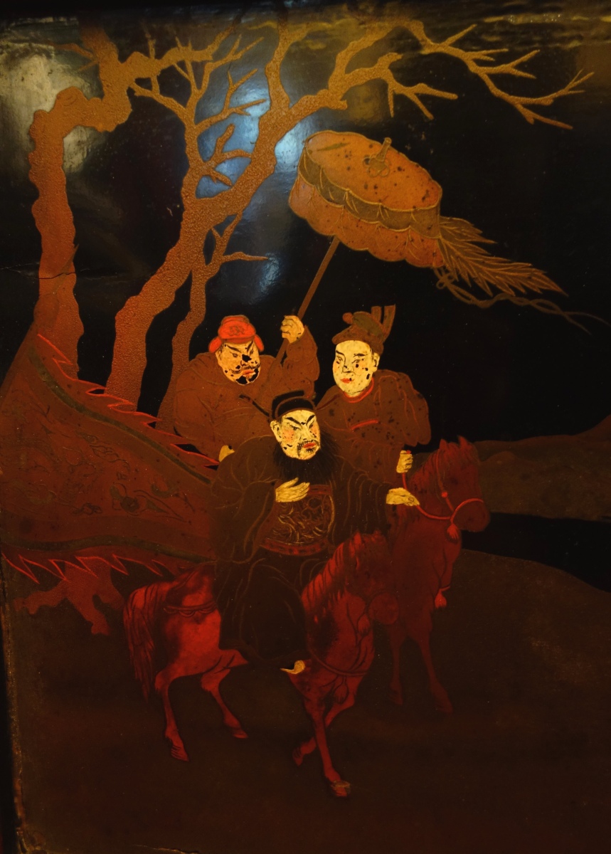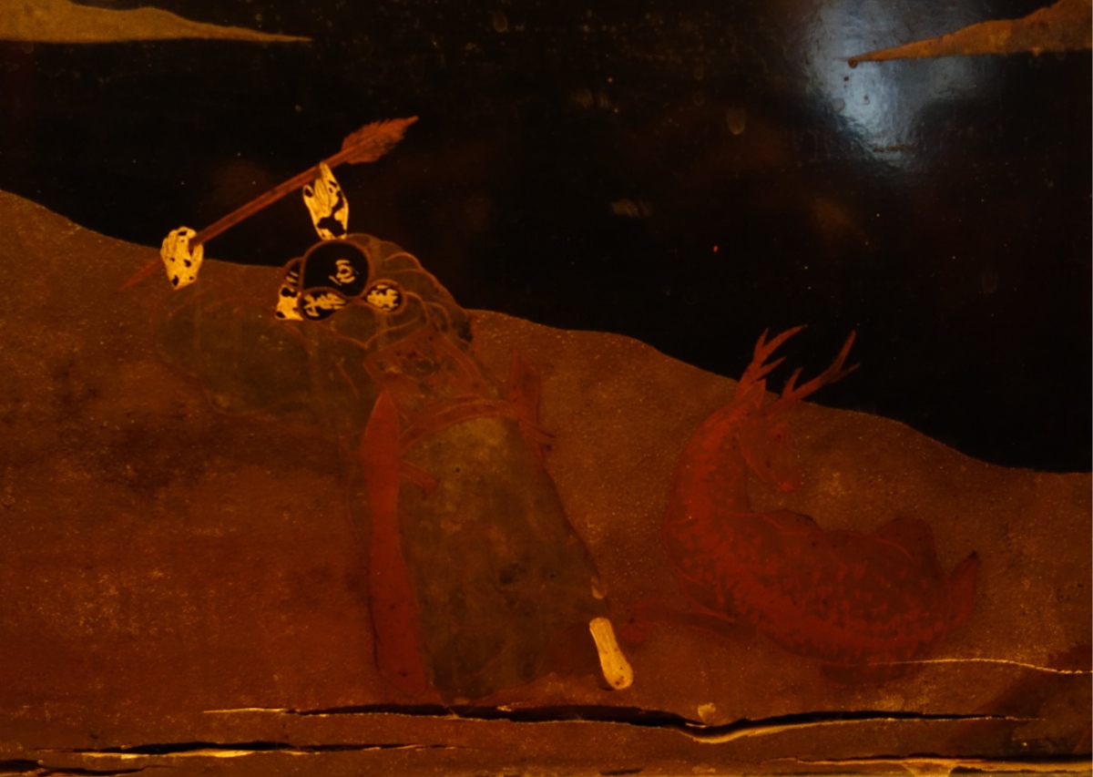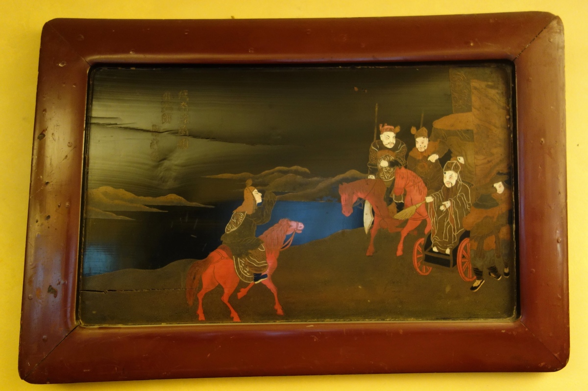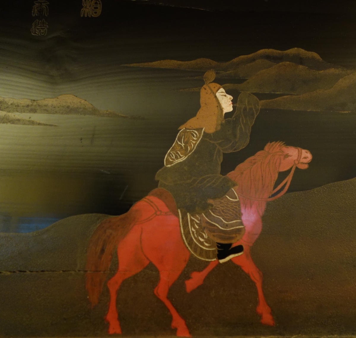 JAPON. Deux PANNEAUX en laque figurant une scène de chasse impériale au cerf. Signé.