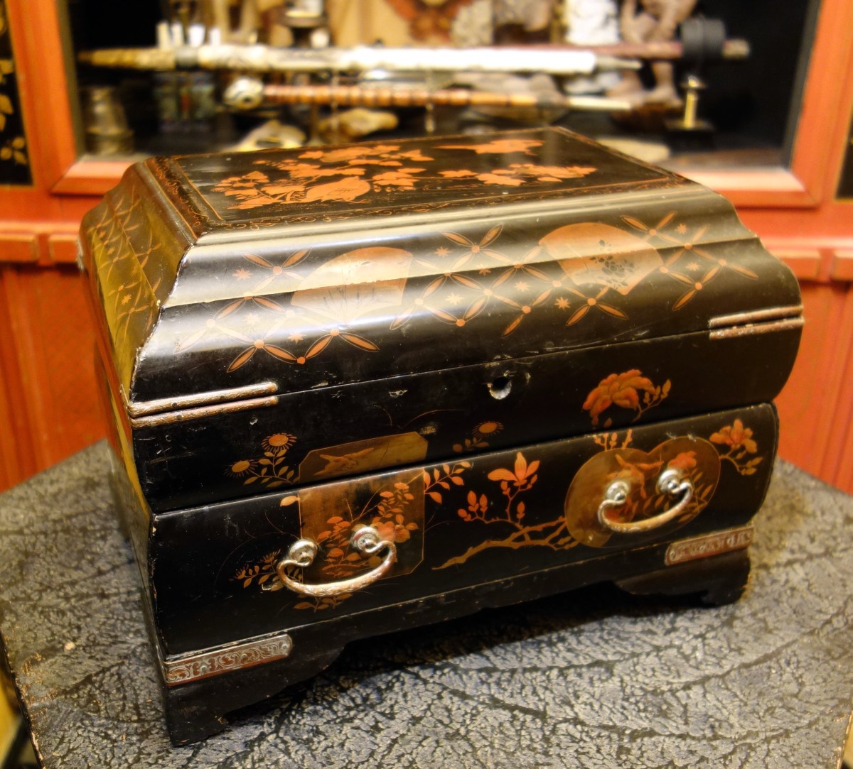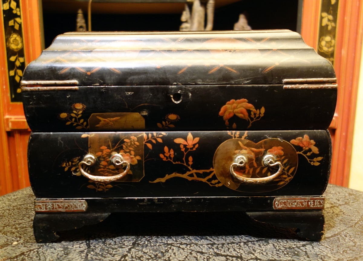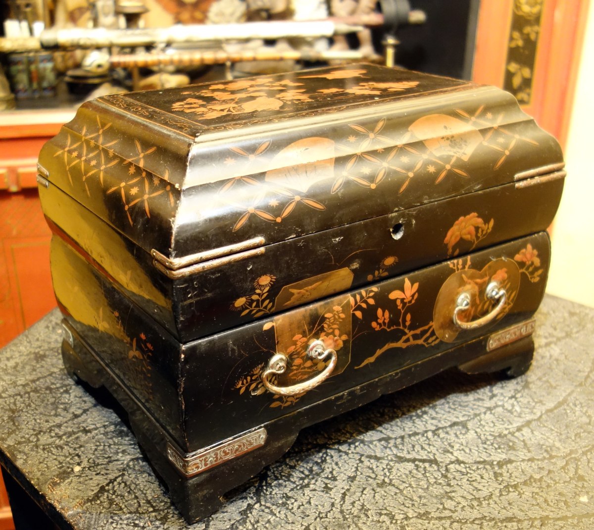 JAPON - Fin XIXe. COFFRET en bois laqué rouge sur fond noir. Il ouvre à un abattant et un tiroir en façade. Décor d'oiseaux sur le couvercle, feuillages et éventails sur les côtés.