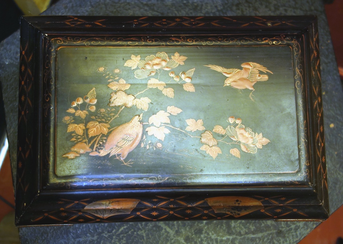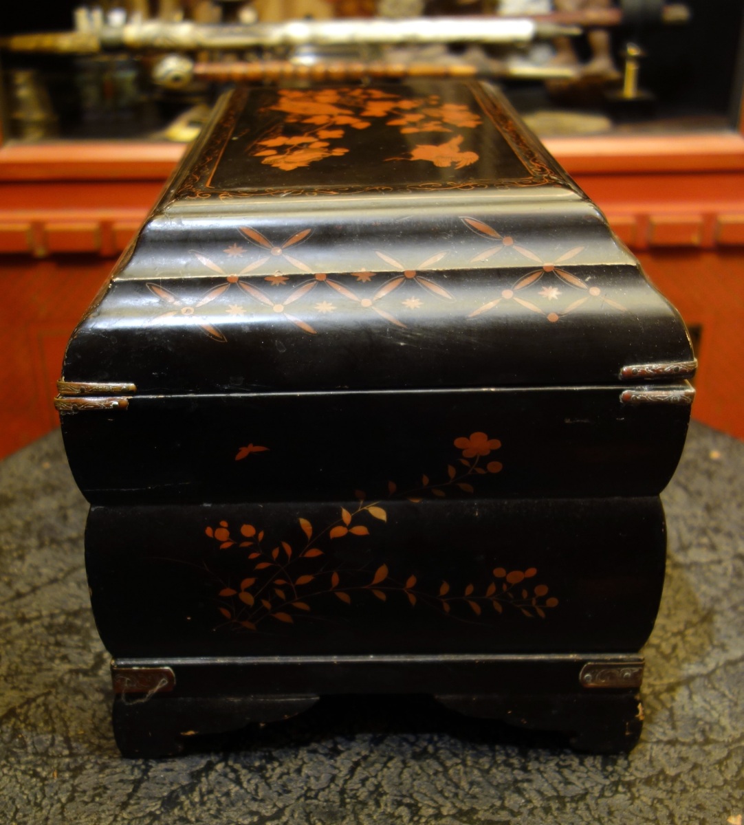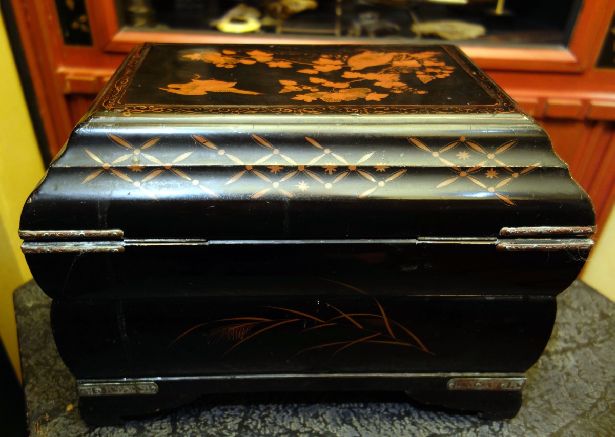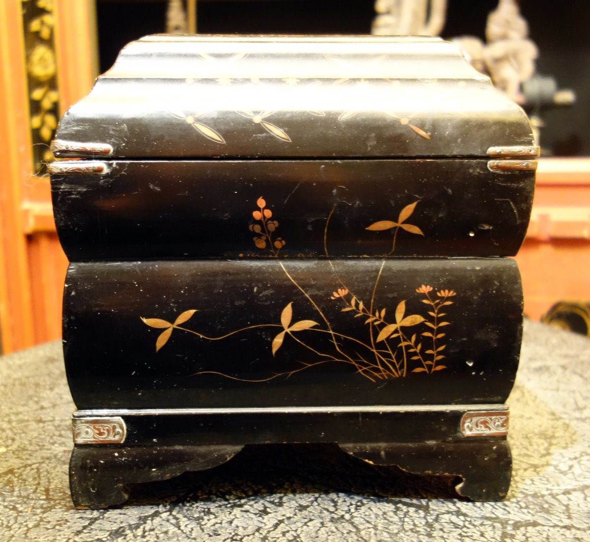 JAPON - Fin XIXe. COFFRET en bois laqué rouge sur fond noir. Il ouvre à un abattant et un tiroir en façade. Décor d'oiseaux sur le couvercle, feuillages et éventails sur les côtés.