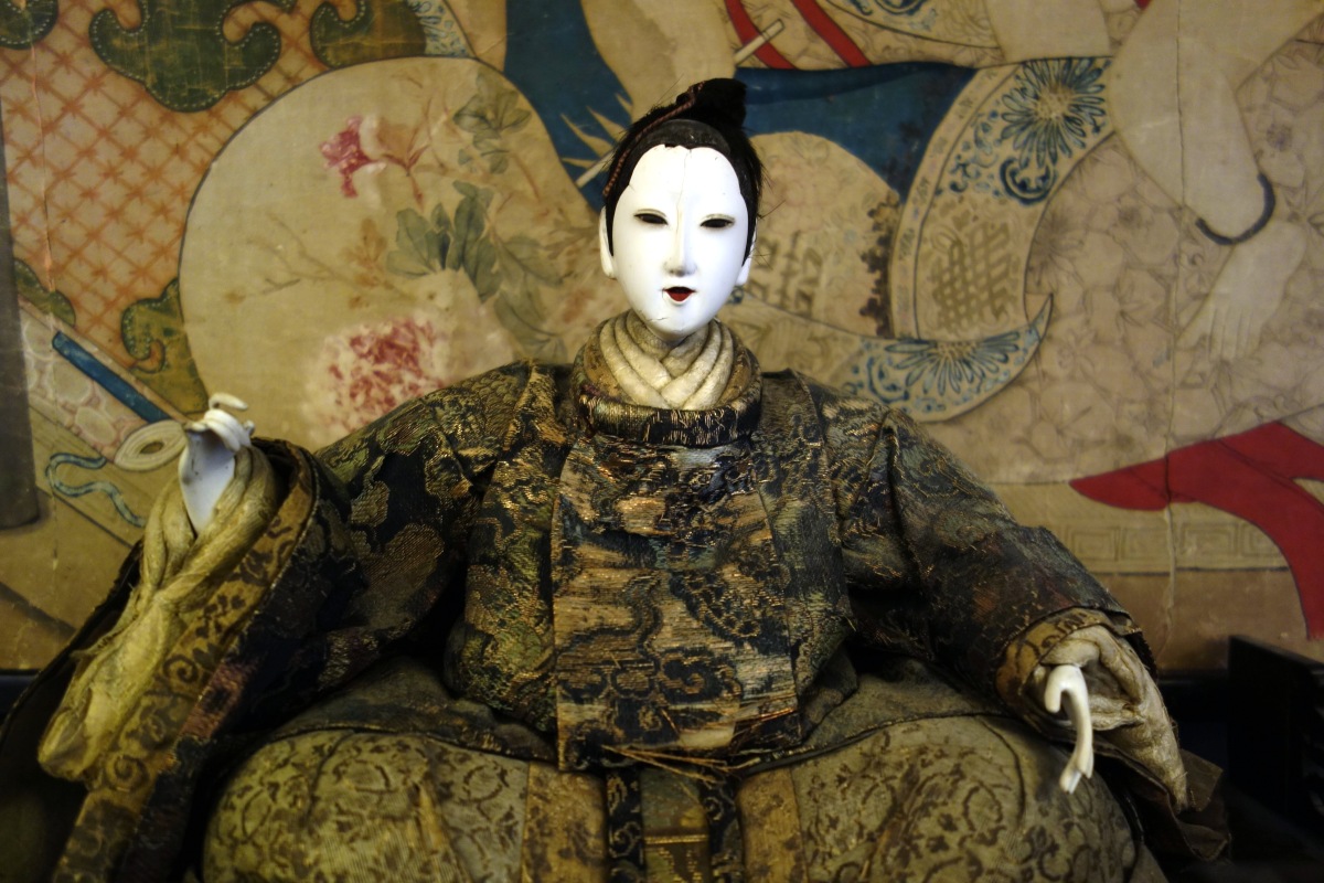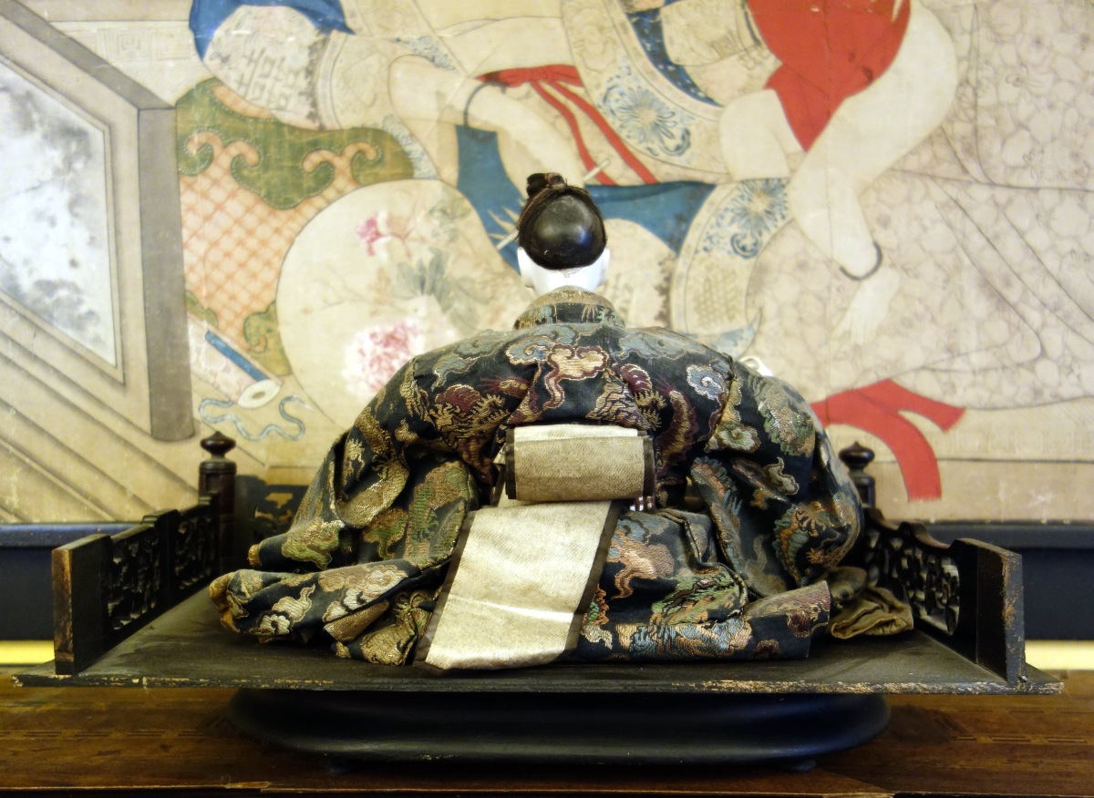 JAPON. POUPÉE représentant un DIGNITAIRE assis en bois laqué et tissu, sur une terrasse en bois sculpté et ajouré.