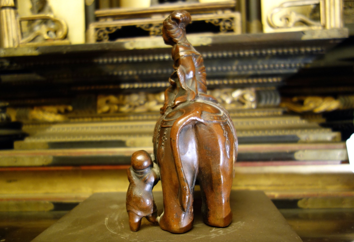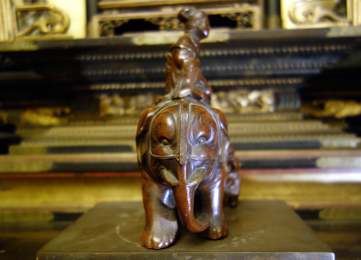 JAPON - Vers 1900. OKIMONO en bronze à patine brune et dorure, jeune femme assise sur un éléphant jouant du qin, un enfant à terre lui tendant un rouleau.