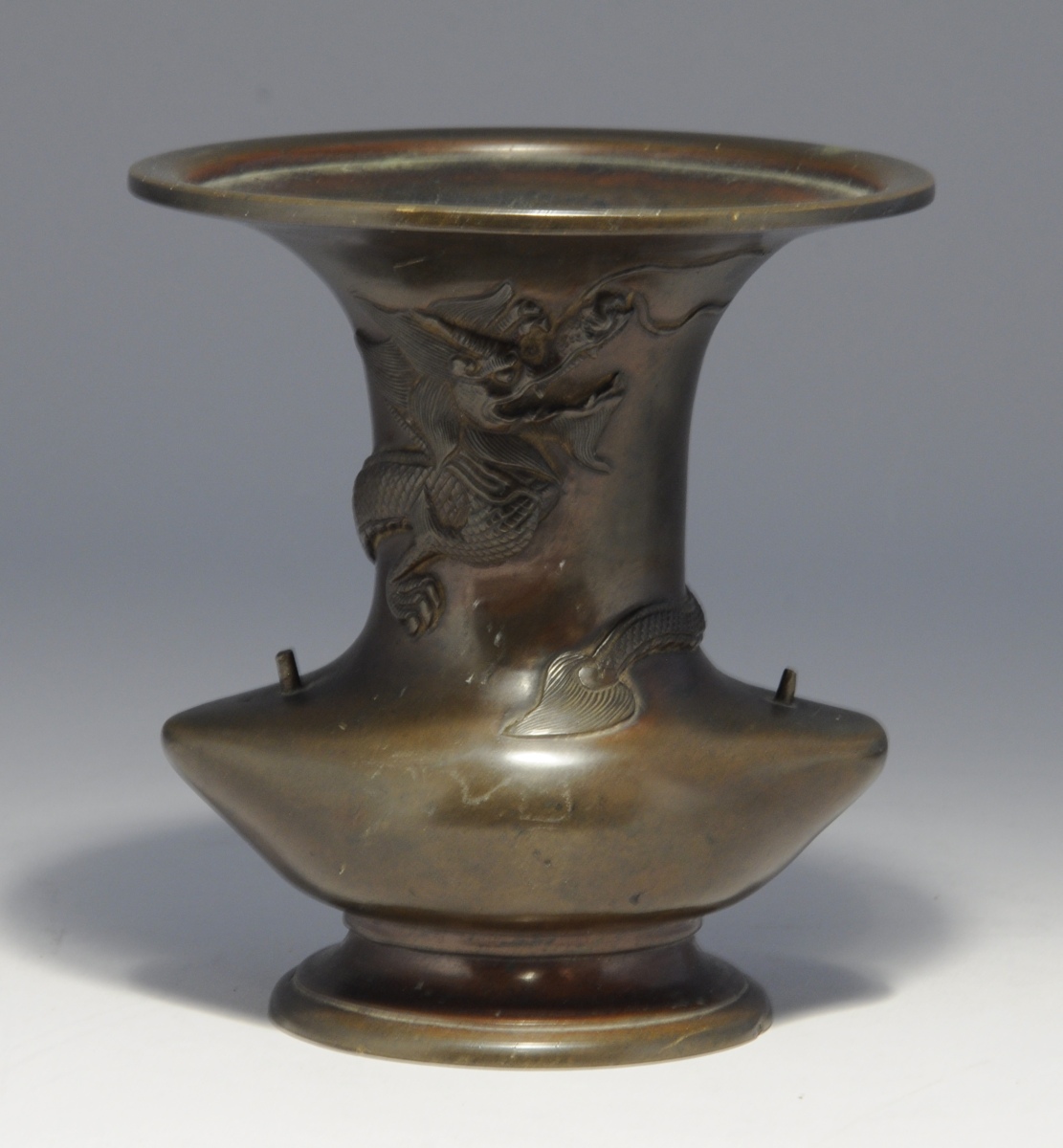 JAPON - Vers 1900. VASE à panse en forme de navette et col évasé, en bronze patiné, figurant un dragon enroulé le long du col.