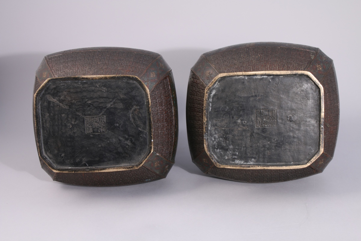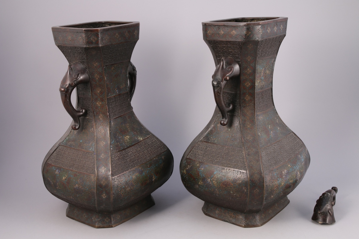 JAPON - Vers 1900. Paire de VASES balustre en bronze à décor de motifs floraux et géométriques en émaux cloisonnés. Anses à têtes d'éléphants. Signature.
