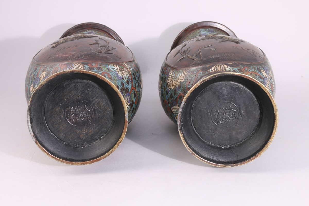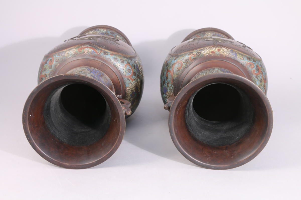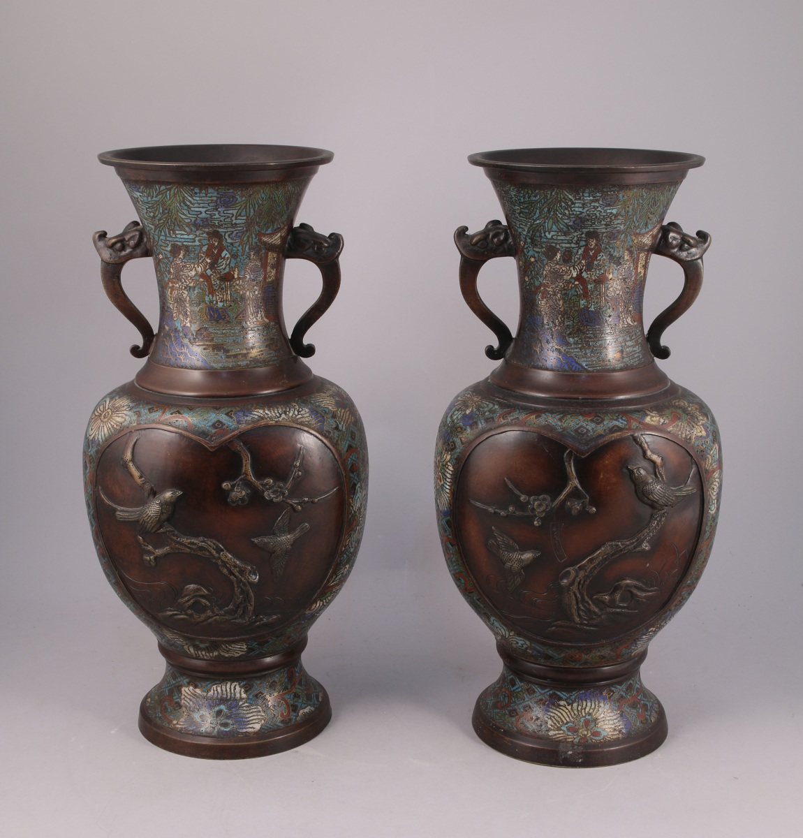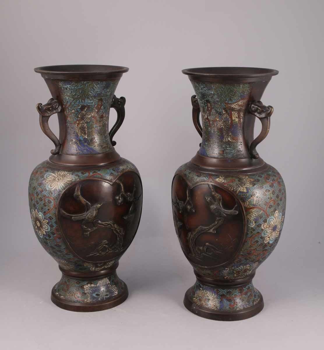 JAPON - Vers 1900. Paire de VASES en bronze à décor d'émaux cloissonnés de personnages et de feuillages. Panse en bas-relief ornée d'oiseaux dans des branchages, les anses à têtes d'éléphants stylisés. Cachet sous la base.
