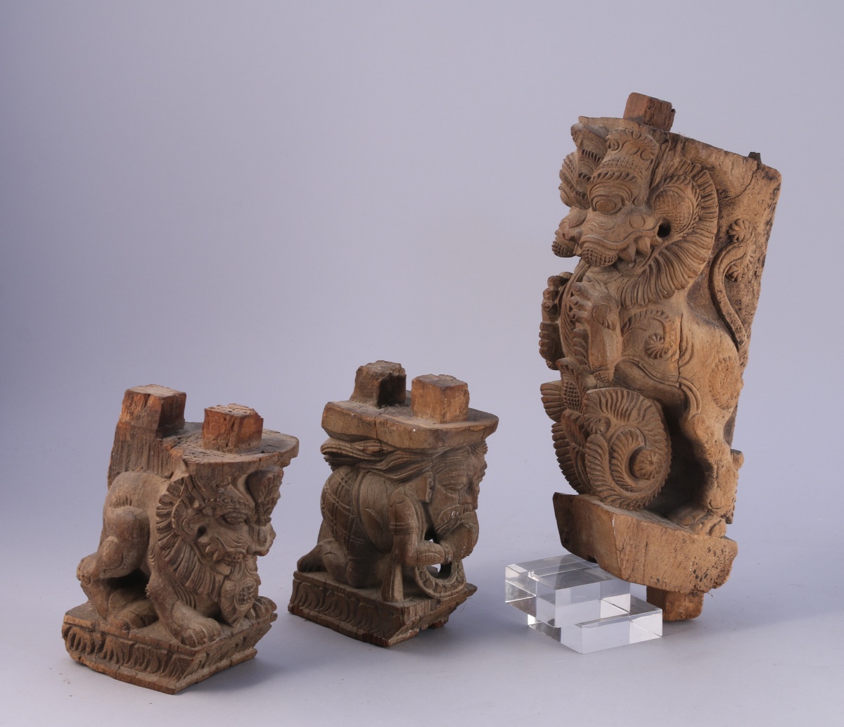 - Une grande et deux petites consoles. La première figure une chimère, les autres un homme barbu et une chimère. Haut. 28, 15 et 16, Prof. 13 et 12 cm.