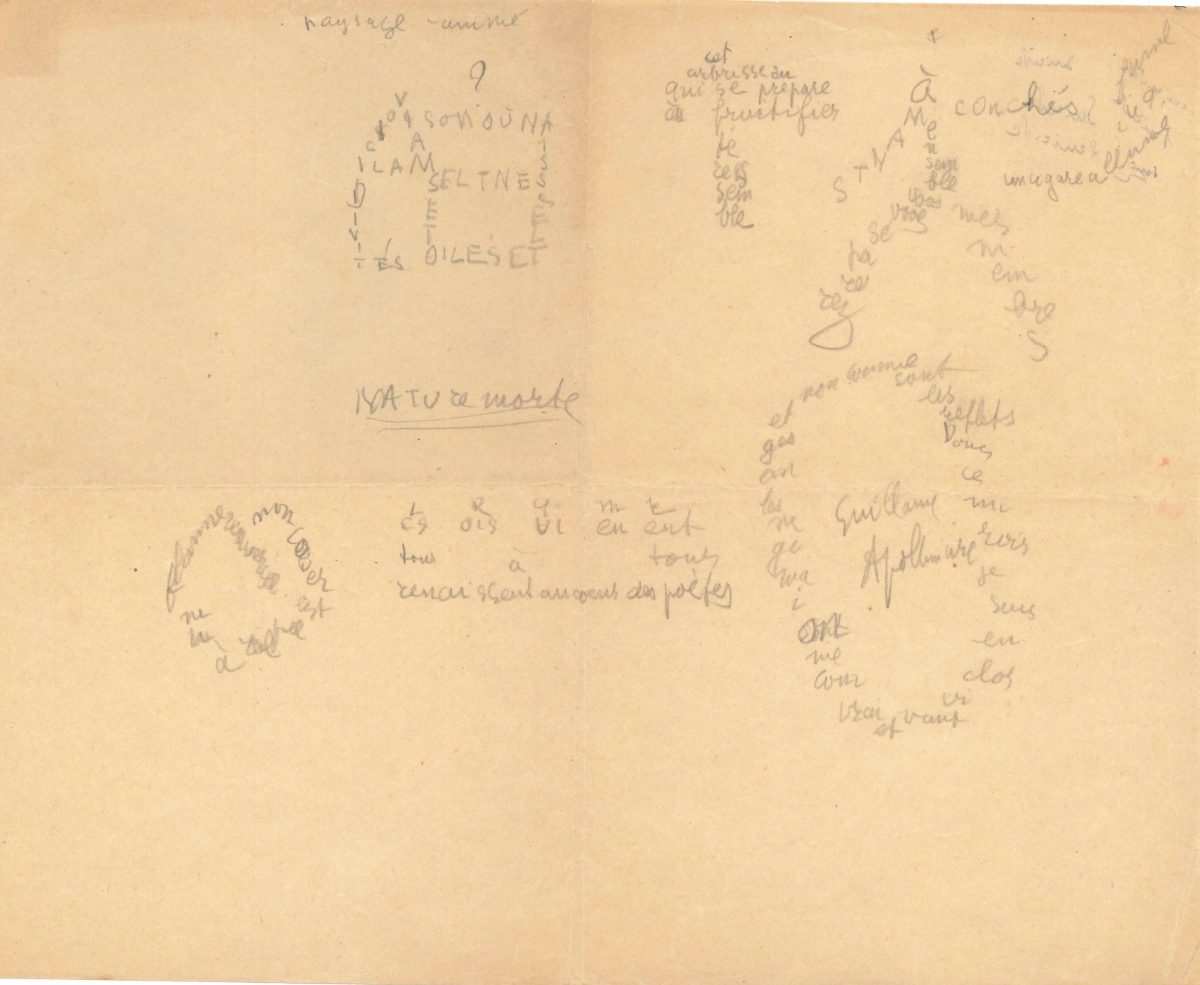 Nature morte : comprend les 3 calligrammes publiés sous le titre Cur couronne et miroir, ici alignés horizontalement, avec des variantes dans la disposition des lettres et le graphisme : " Mon cur est pareil "