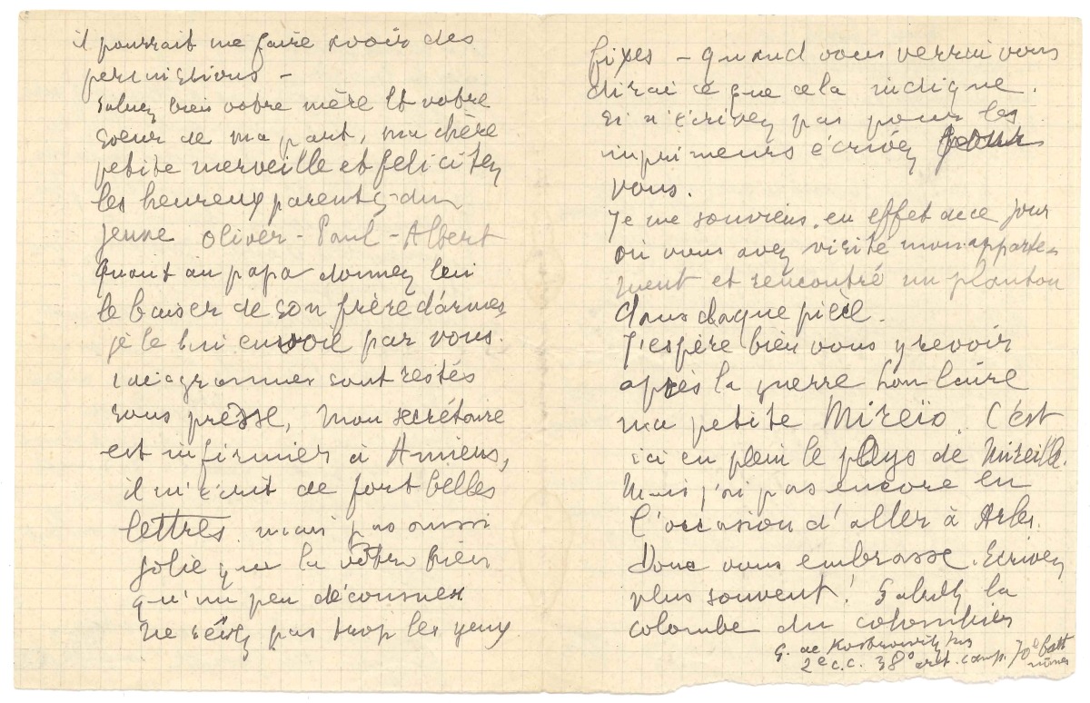 Il pense qu'" il y en a encore pour plusieurs années, peut-être deux, peut-être plus. Je souhaite moins, mais le moyen d'y croire. Intéressez-vous donc un peu à cette guerre extraordinaire. Au demeurant, j'aimerais, c'est vrai, effeuiller la marguerite auprès de vous, mais il faut se faire une raison. Et puis comme je n'ai pas de petite fiancée, autant effeuiller les jours de guerre pour qu'ils s'en aillent plus vite ". Et il prie Mireille de le recommander à son oncle le préfet du Gard [Louis Hudelo] : " comme ça il pourrait me faire avoir des permissions ". Il la charge de saluer sa mère, sa sur, et toute la famille
