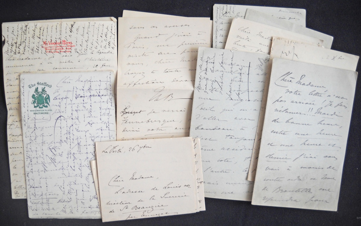 Env. 40 L.A.S. ou L.A., 1897-1902, adressées à Sophie de CASTELLANE. Intéressante correspondance dont plusieurs lettres envoyées lors de son second voyage aux Etats-Unis en 1897 ou de son voyage en Russie en 1901, extraits : " Baltimore Chère madame je vois que la légende commence à se mêler à l'histoire pour ce qui me concerne (…) Je n'ai et ne parlerai jamais en public de ma vie. Le fait est qu'on m'a demandé plusieurs fois de dire un mot dans ces innombrables clubs auxquels appartiennent toutes les dames américaines et que j'ai toujours refusé sauf pour remercier brièvement de ma place du bon accueil qu'on me faisait, une seule fois à Harvard j'ai consenti pour être agréable à la veuve du grand naturaliste (…) à lire aux étudiants du club français quelques lettres de George Sand, les lettres qu'elles m'avait adressées autrefois sont très belles et renferment beaucoup de conseils intéressants pour les filles résolues à prendre une carrière (…) A New-York la vie mondaine m'avait un peu trop prise : dîners, théâtres, etc mais à Philadelphie j'ai retrouvé l'Amérique quakeresse et puritaine avec tous ses grands commencements historiques (…) je suis allée rendre mes devoirs à ce grand prélat libéral Mgr Gibbons qui, avec le pape, me paraît la plus remarquable figure de ce temps-ci. Il m'a reçue d'une façon charmante, s'intéresse aux femmes qui travaillent, ne craint pas la science et ne peut comprendre qu'en France l'église se croit obligée de bouder la république. elle ne serait pas catholique, elle ne serait pas universelle a-t-il dit si elle ne savait s'adapter à toutes les institutions humaines (…) L'église de couleur prospère en ce moment très encouragée. Il y a des prêtres et des religieuses noires tout à fait intéressants… " - " Saint Pétersbourg 30 octobre (…) De fait rien ne m'a intéressée que Moscou ; c'est la plus bizarre de toutes les villes, une espèce de village immense où les palais côtoient les cabanes, où tous les costumes et tous les types se donnent rendez-vous, où une espèce de muraille chinoise, crénelée, fortifiée, entoure et garde toutes les curiosités historiques de l'Empire. Un pays qui n'a jamais eu de révolution possède intacts les souvenirs du passé ; rien ne s'est jamais perdu les trésors du Kremlin, toute l'histoire de Russie se déroule dans ces appartements sous air enluminés comme les potiches (…) Ce n'est qu'une grande belle capitale à l'instar de Paris ou de Londres et cependant quelles matinées je passe à l'Ermitage dans ces galeries, assez peu nombreuses en somme, mais où tout est de premier ordre. Il ya une Vierge du Connétable de Raphaël et une Madone Lita de Léonard de Vinci que je voudrais vous porter et les Velasquez qui vous rappelleraient Madrid et les plus beaux Rembrandt du monde… " - etc.