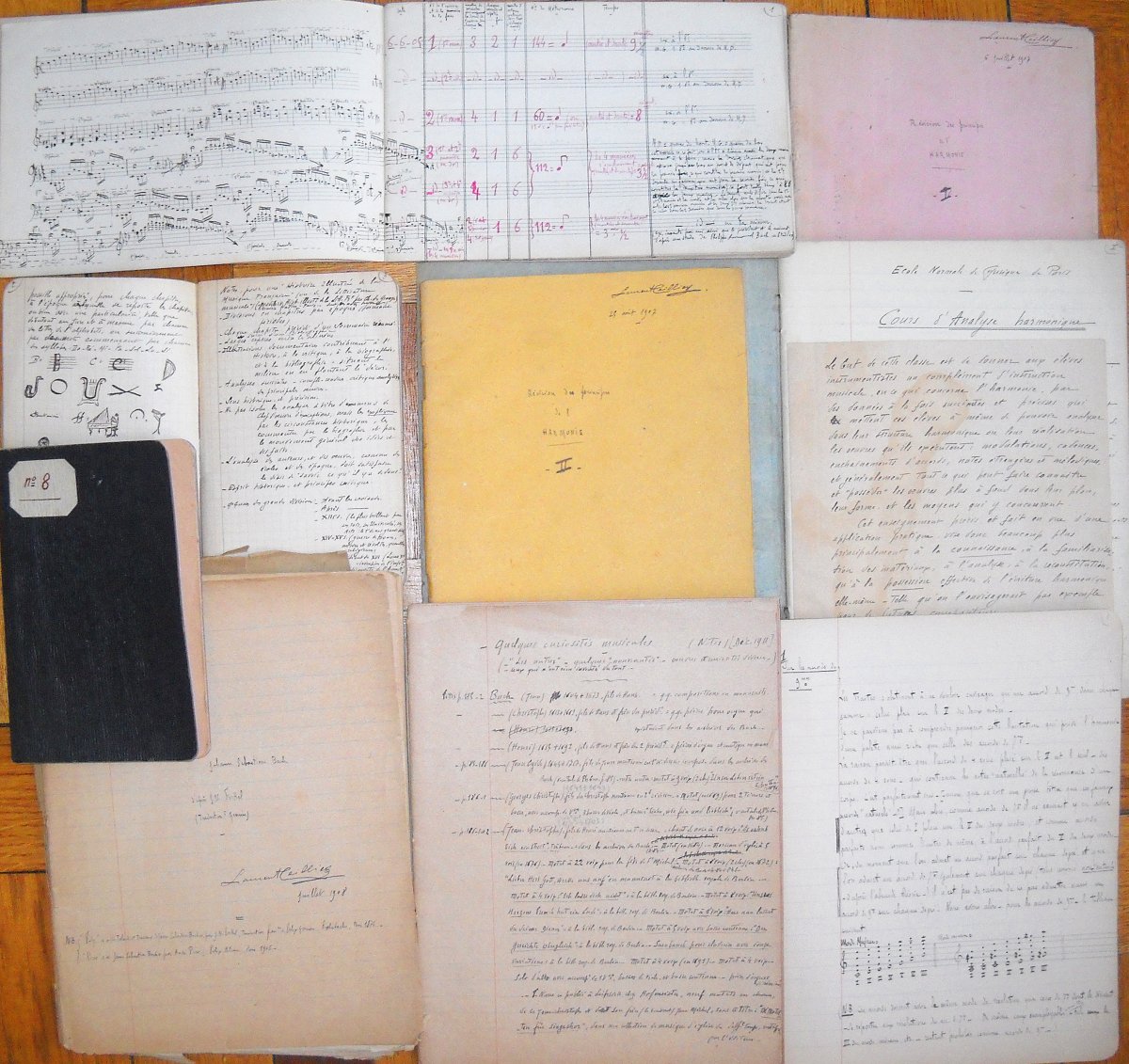 Lot de documents musicaux contenant divers travaux de recherches et d'érudition, notes manuscrites, articles et publications, 1er quart du XXe siècle, dont : programmes et annonces de concerts, début XXe - Notes sur Bach - Extraits d'articles écrits par L. Ceillier dans la revue Le Guide du Concert (11 n° et + de trente feuillets) 1920-1924 - Le Guide du Concert, numéro hors-série consacré à Camille SAINT SAËNS contenant un article de L. Ceillier : " Personnalité et évolution de Saint Saëns " - Ouvrage de Laurent Ceillier : " Roger-Ducasse, le musicien, l'uvre " Paris, éd. Durand, 1924, en l'état - Cahier de notes manuscrites, tableau chronologique détaillé de la vie et l'uvre de Robert Schumann - Cahier de notes manuscrites extraites de l'ouvrage d'André Piro : " L'orgue de J. S. Bach ", avec dédicace de l'auteur : " Hommage reconnaissant de l'auteur à Monsieur Ceillier - André Piro 12 février 1914 " - Coupures de presse, invitations et programmes de concert en 1921 - + d'une centaine de notes manuscrites et articles imprimés, fragments de partitions musicales - 3 petits carnets de compilation de notes manuscrites sur divers thèmes (harmonie, curiosités musicales, vieux Paris musical, J. S. Bach, etc), écrits en 1916 et 1917 - Cahier ayant pour titre " Harmonie " de 21 pp manuscrites à l'encre bleue - 4 cahiers in-fol. contenant des extraits d'articles de revues écrits par L. Ceillier entre 1912 et 1923 - Env. 70 fiches manuscrites (au verso de faire-parts) sur divers thèmes d'études relatifs à la musicologie, histoire de la musique, analyse du langage musical. - Programme dédicacé par Tatiana de Sanzewitch et affiche du concert donné le 1er mars 1924 à l'École Normale de Musique de Paris - Programme du cycle des concerts " des chefs-d'uvre du piano au XIXe siècle " donnés et organisés par Alfred Cortot en mai 1924. - 2 cahiers de notes manuscrites titrés " Révision des principes de l'harmonie " (1907) - Cahier avec notes manuscrites titré " Notes sans valeurs " (1909) - Cahier de " Cours d'analyse harmonique ", École Normale de Musique de Paris, 1919 - etc.