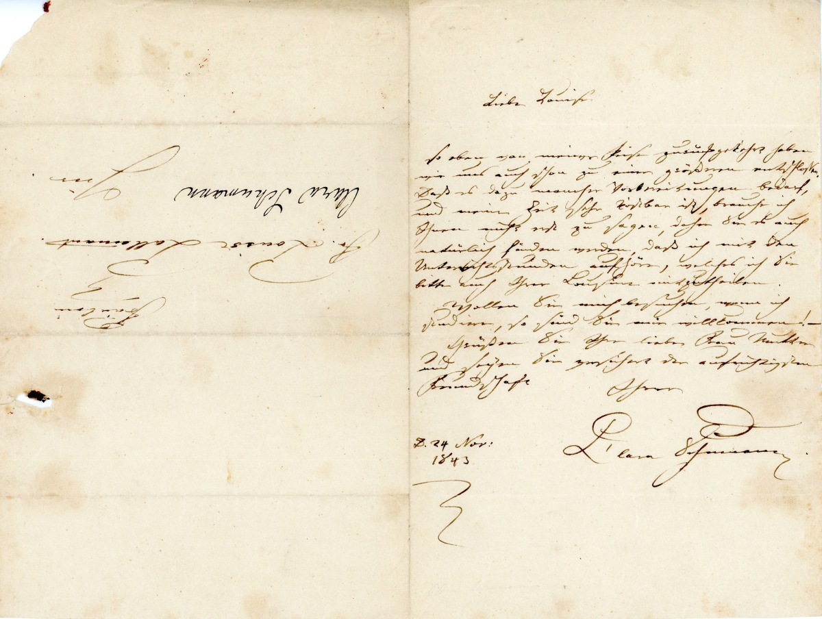 L.A.S., en allemand, datée " D. 24 nov. 1843 ", adressée à " fr. Louise LALLEMANT ", son élève à qui elle lui écrit que de retour de son voyage, bien qu'elle court après le temps, son élève sera toujours la bienvenue ; 1 page in-8. Lettre référencée par la base de données " Schumann-Briefdatenbank " n°8077.