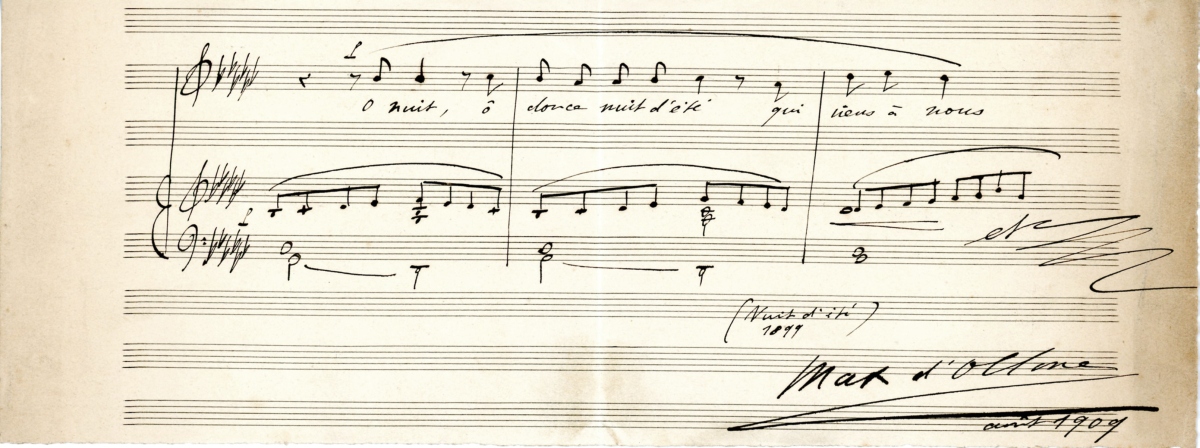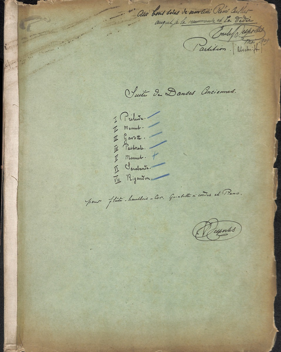 Pablo CASALS (1876-1973), manuscrit musical autographe " Violoncelle ", 1907, à l'encre noire et crayon, avec mention en haut de page au crayon bleu " 1907 concours violoncelle ", 4 pages in-fol., et en fin de page " Villa Molitor, Paris, 16e ", texte manuscrit et signé du compositeur : " Cher ami, les mesures barrées ne comptent pas, le morceau était un peu long et j'ai dû le rétrécir autant qu'il était possible. Le morceau lui même est serré - mais le nombre de mesures m'était limité par le comité du conservatoire - malgré tout vous y trouverez un premier motif, développement, deuxième motif, ralliement au premier motif et coda. Le tout me rappelle un parc japonais que j'ai vu dans le temps en Californie qui contenait grand nombre d'arbres, de sentiers, des lacs, des ponts le tout en un emplacement de quelques mètres. Vôtre Pablo Casals " - Max d'OLLONE (1875-1959), morceau de manuscrit musical autographe, sur papier oblong, à l'encre, fragment de mélodie en sol b M " O nuit, ô douce nuit d'été ", avec mention " Nuit d'été, 1899 ", signature du compositeur et daté août 1909. - Emile DESPORTES (1878-1944), manuscrit musical autographe " Suite de danses anciennes " pour orchestre, 7 morceaux, à l'encre, 26 pages in-fol. dans une chemise verte cartonnée sur laquelle est inscrite un envoi signé : " Aux bons soins de mon ami Rémi Ceillier auquel je la recommande et la dédie/ mai 1909 ". - Reproduction gravée de l'édition primitive de La Marseillaise, vers 1865-1870, avec envoi signé du petit neveu de Rouget de l'Isle, 4 pages in-4.