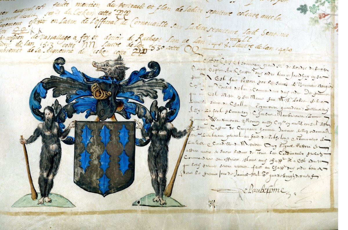Bel arbre généalogique à décor peint à l'aquarelle avec rehauts à l'or et orné des premières armoiries de la famille de Cosker de la Vieuville : d'or à sept feuilles de houx d'azur 3, 3 et 1, les tiges en bas. Soutenues par deux sauvages velus, une massue sur l'épaule, sommées d'une large couronne de marquis qui surmonte un énorme casque avec ses lambrequins et une hure de sanglier pour cimier.