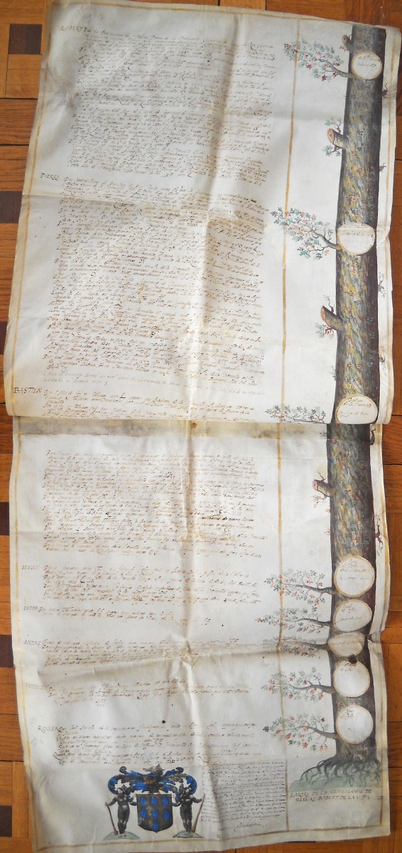 Pièce justificative comme preuve de noblesse remise à la commission de l'Ordre du Saint Esprit (fondé en 1578 par Henri III), par Robert de la Vieuville, conseiller au conseil d'état et privé du roi, capitaine de cinquante hommes d'armes, lieutenant général au pays de Rethélois, gouverneur de la ville et forteresse de Metz. La réception eut lieu le 4 janvier 1599.