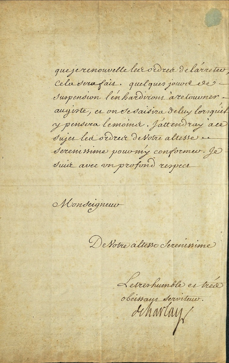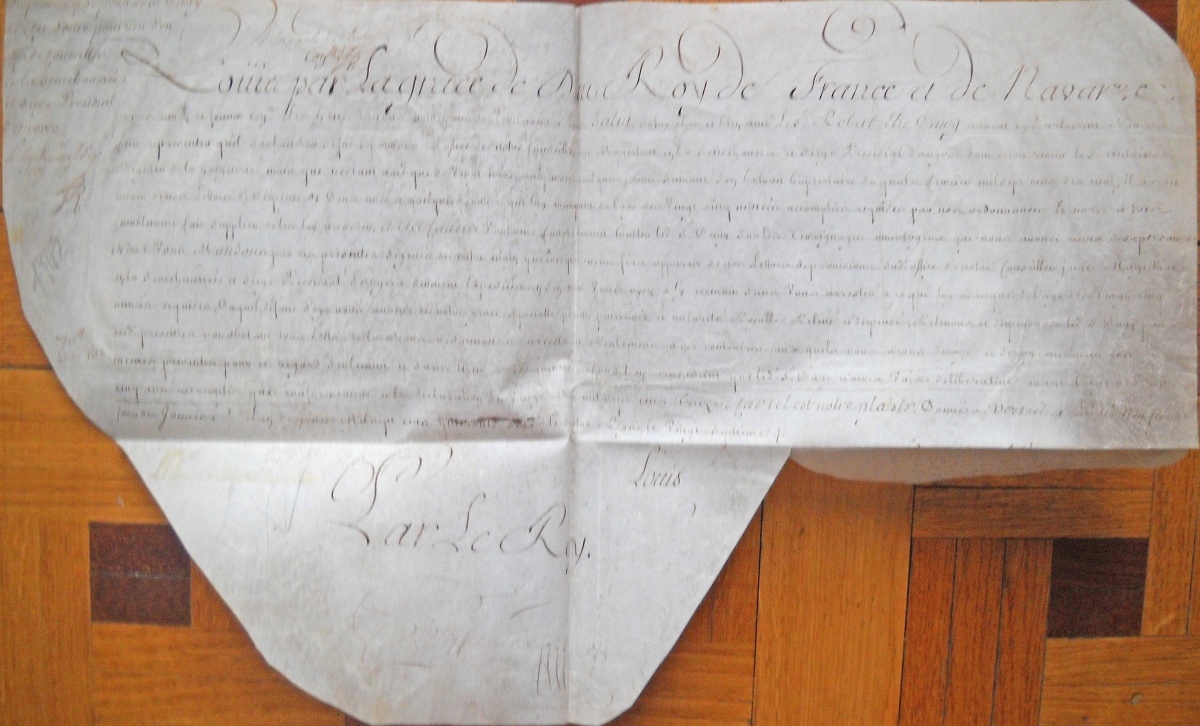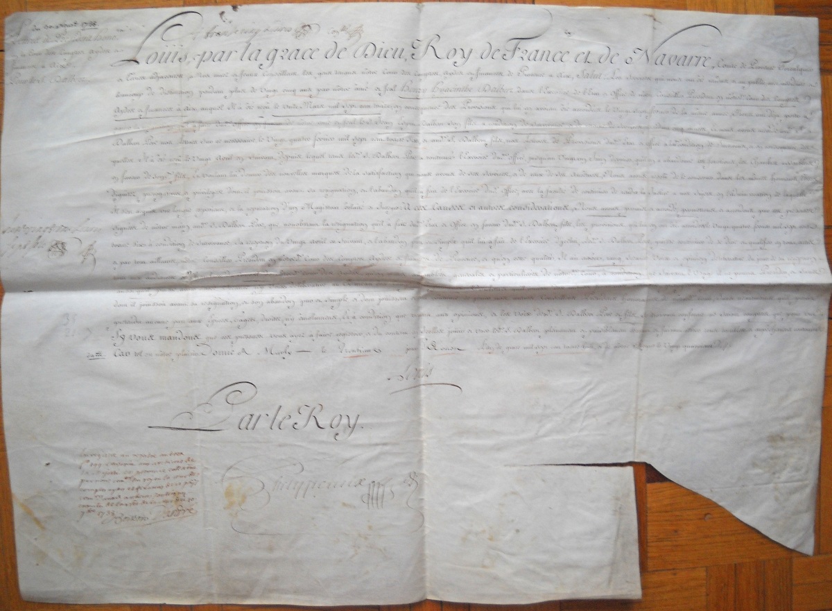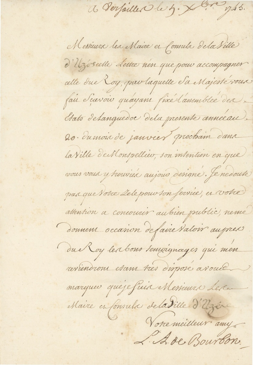 P.S. " Louis ", Marly, 30 août 1738, et contresignée par Jean-Frédéric PHELYPEAUX, comte de Maurepas, secrétaire d'Etat de la Maison du roi, 1 page obl. vélin in-plano ; lettres patentes du roi accordées à Henri Hyacinthe DALBERT pour l'office de président honoraire en la cour des comptes et aydes à Aix-en-Provence. (pliures, manques au coin droit) - L.S. par Louis-Auguste Achille de HARLAY (1679-1739), intendant de la généralité de Paris, Paris, 22 mai 1739, adressée à Louis-Auguste de Bourbon, prince de Dombes, 2 pages in-fol. ; au sujet de l'arrestation du maître du bac de Choisy - P.S. " Louis ", Versailles, 19 janvier 1742, et contresignée par Jean-Frédéric PHELYPEAUX, comte de Maurepas, secrétaire d'Etat de la Maison du roi, 1 page obl. vélin in-fol. ; dispense d'âge accordée à Robert Elie Davy, avocat en parlement, pour remplir les fonctions de magistrat en la sénéchaussée et siège présidial d'Angers [poursuivra sa carrière à Saint Domingue]. (pliures, manques qui n'altèrent pas le texte) - L.S. par Louis Auguste de BOURBON (1700-1755), petit-fils de Louis XIV et gouverneur de la province du Languedoc, Versailles, 5 décembre 1745, 1 page in-fol. ; convocation adressée à la communauté des habitants d'Uzès pour la réunion des Etats généraux du Languedoc prévue le 20 janvier 1746 à Montpellier. - P.S. " Louis ", Versailles, 25 septembre 1771, et contresignée par Louis PHELYPEAUX de Saint Florentin, secrétaire d'Etat de la Maison du roi, 1 page obl. vélin in-fol. ; dispense d'âge accordée à Michel Dumes pour obtenir la charge de procureur du roi en la ville d'Avesnes en Hainault et Cambraisis [Pas de Calais]. (pliures, manques qui n'altèrent pas le texte)