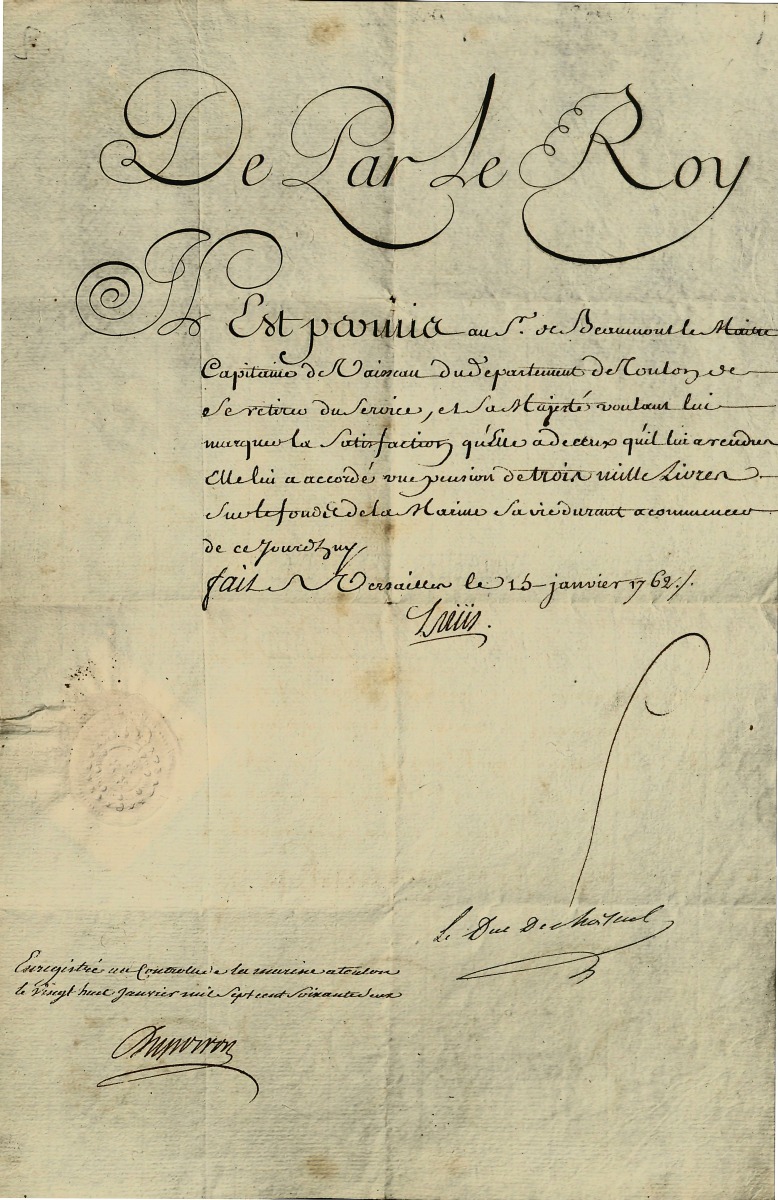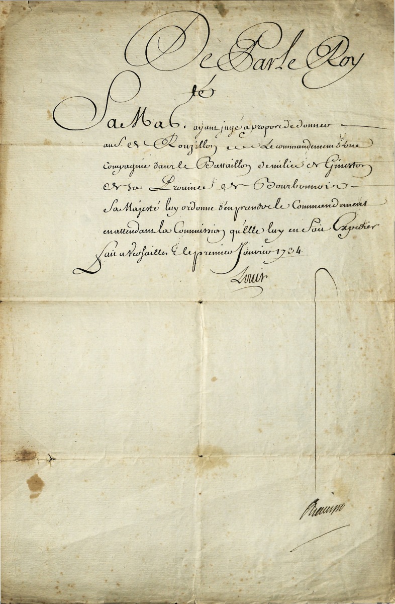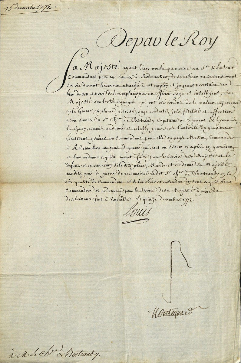 P.S. " Louis ", Versailles, 1er janvier 1737, et contresignée par Nicolas-Prosper BAUYN d'Angervilliers, secrétaire d'Etat de la Guerre, 1 page in-fol. ; commission du commandement d'une compagnie dans le bataillon de milice de Gineston en la province de Bourbonnais, accordée au sieur de Rousillon. (pliures, rousseurs, petits trous) - P.S. " Louis ", Versailles 20 septembre 1747, et contresignée par Marc-Pierre de Voyer de Paulmy, comte d'Argenson, secrétaire d'Etat de la Guerre et ministre d'Etat, 1 page in-fol. ; Commission de premier lieutenant de la compagnie du chevalier d'Esquilles accordée au chevalier de Sainte Marie [Allard de Sainte Marie, originaire de Louisbourg au Canada] premier lieutenant de la compagnie de Saint Martin dans le régiment de Cantabres volontaires de Bela. (pliures, rest. ancienne) - P.S. " Louis ", Versailles, 27 mai 1749, et contresignée par Marc-Pierre de Voyer de Paulmy, comte d'Argenson, secrétaire d'Etat de la Guerre et ministre d'Etat, 1 page obl. vélin ; commission de mestre de camp de cavalerie accordée à Charles Louis DARET de Champsoing, maréchal des logis en la compagnie des 200 chevau-légers de la garde du roi (pliures) - P.S. " Louis ", Versailles, 1er janvier 1751, et contresignée Marc-Pierre de Voyer de Paulmy, comte d'Argenson, secrétaire d'Etat de la Guerre et ministre d'Etat, 1 page in-fol. ; Commission de capitaine commandant le bataillon du régiment de la Marine à Charles de JOUGLEINS de Monconseil. [originaire du Bordelais] (pliures, petite déchirure, manques dans les coins, rest. anciennes) - P.S. " Louis ", Versailles, 13 décembre 1761, et contresignée par le duc de CHOISEUL (tampon), secrétaire d'Etat de la Guerre et de la Marine, 1 page vélin obl. in-fol. ; brevet de cornette de la compagnie de Servière dans le régiment de dragons de Chapt accordé à Pierre de GRIPIERE-MONCROC [originaire de Laval]. (pliures, tâches) - P.S. " Louis ", Versailles, 15 janvier 1762, et contresignée par le duc de CHOISEUL (tampon), secrétaire d'Etat de la Guerre et de la Marine, 1 page in-fol., cachet à sec ; brevet de pension accordé Beaumont Lemaître capitaine de vaisseau [Jean-François Lemaître de Beaumont, maire de Marseille de 1770 à 1772]. (pliures) - P.S. " Louis ", Versailles 15 décembre 1772, et contresignée par Louis François de MONTEYNARD, secrétaire d'Etat de la Guerre, 1 page in-fol. ; commission du commandement de place forte de Rodemack [près de Metz en Moselle] accordée à Marie Philippe Hubert chevalier de Bertrandy, capitaine au régiment de Lyonnais. (pliures)
