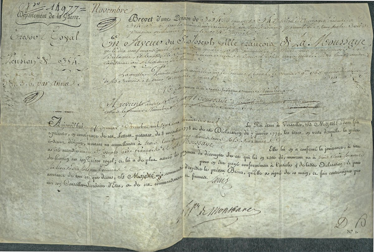 P.S. " Louis ", Versailles, 1er septembre 1779, et contresignée par le prince de MONTBAREY, secrétaire d'état à la guerre, 1 page obl. vélin in-folio ; brevet de pension accordé à Joseph Gilles François de la MOUSSAYE (1724-1794), chevalier de Saint Louis, capitaine au régiment de Provence-Infanterie. - Pièce imprimée " Loi relative à la nomination du gouverneur de M. le Dauphin ", Paris, 29 juin 1791, 3 pages in-4 (dernière page raccourcie sans altérer le texte) - P.A.S. par Adèle de Bourbon d'Orléans, ou Madame Adélaïde, fille de Philippe-Egalité, sur cadette de Louis-Philippe, datée du 8 novembre 1793 à Bremgarten [au couvent Sainte-Claire, en Suisse], ½ page in-4 ; Billet de quittance établi lors de son exil en Suisse au couvent Sainte-Claire de Bremgarten.