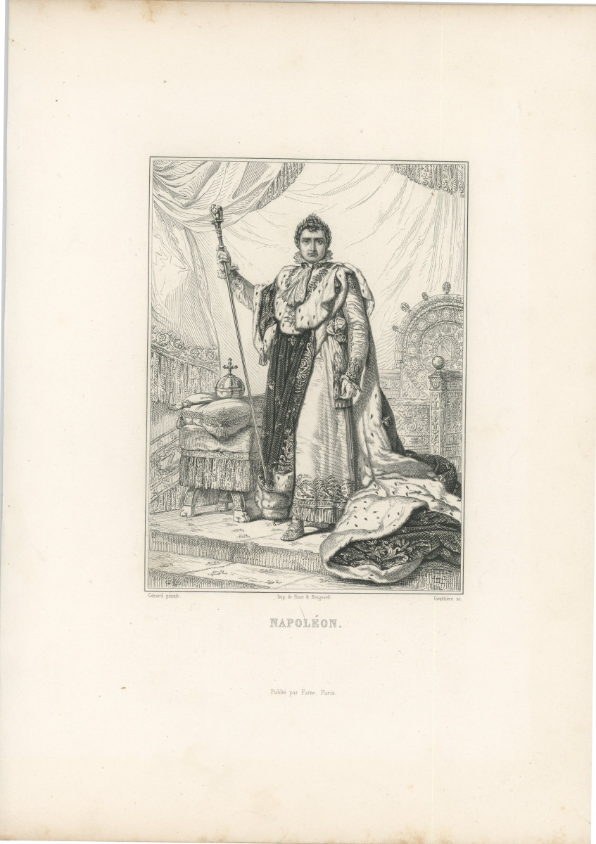 JOINT : une gravure de " Napoléon " imprimée par Finot et Bougeard, publiée par Furne à Paris, d'après l'uvre de Gérard, vers 1850, 29 x 21 cm.