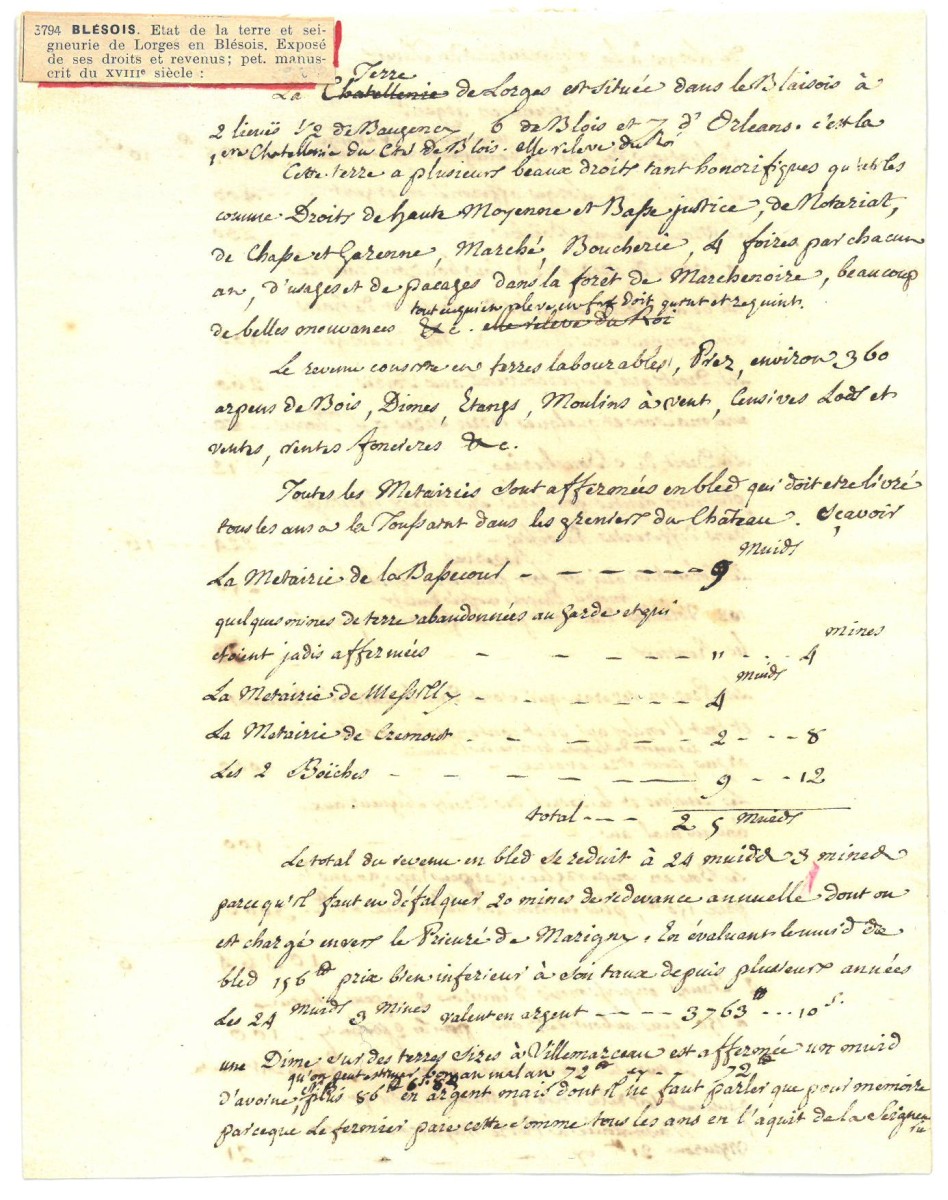 [Loir-et-Cher - Lorges] Manuscrit. État de la seigneurie et de la terre de Lorges en Blésois, XVIIIe siècle.