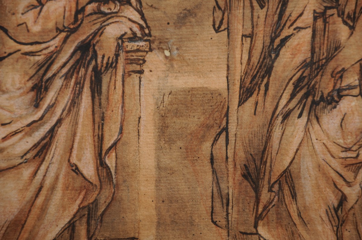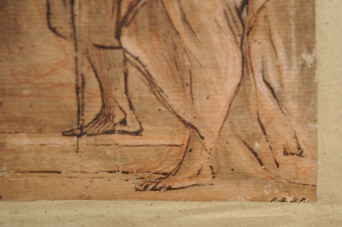 Plume et encre brune sur traits de sanguine et de crayon noir, lavis brun, lavis de sanguine, rehauts de gouache blanche.