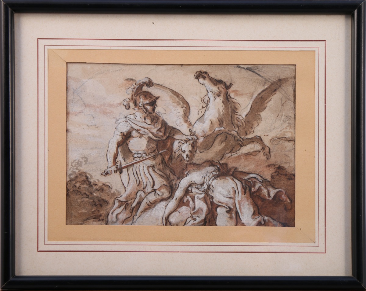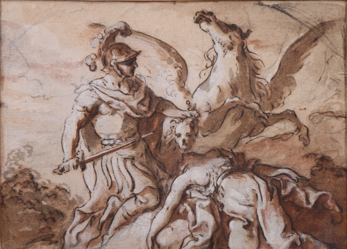 Plume et encre brune, lavis brun lavis de sanguine rehauts de gouache blanche sur traits de crayon noir.