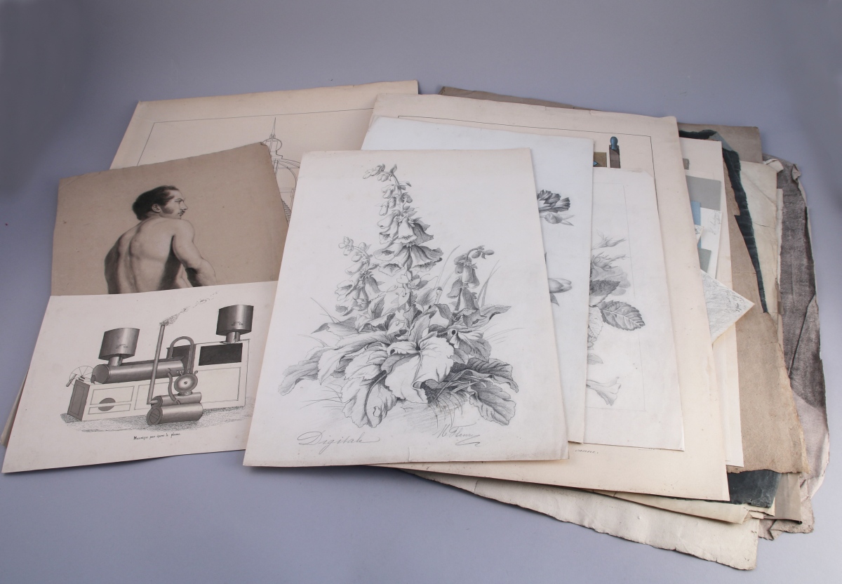 Importante RÉUNION d'environ 75 DESSINS et AQUARELLES du XIXe siècle. Sujets divers : portraits, paysage, architecture, mécanique, fleurs... À découvrir, en l'état.