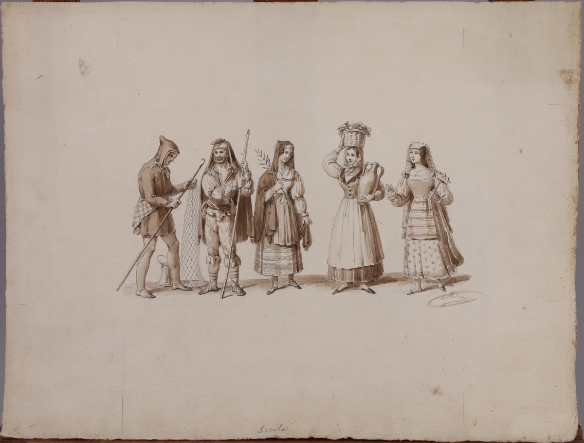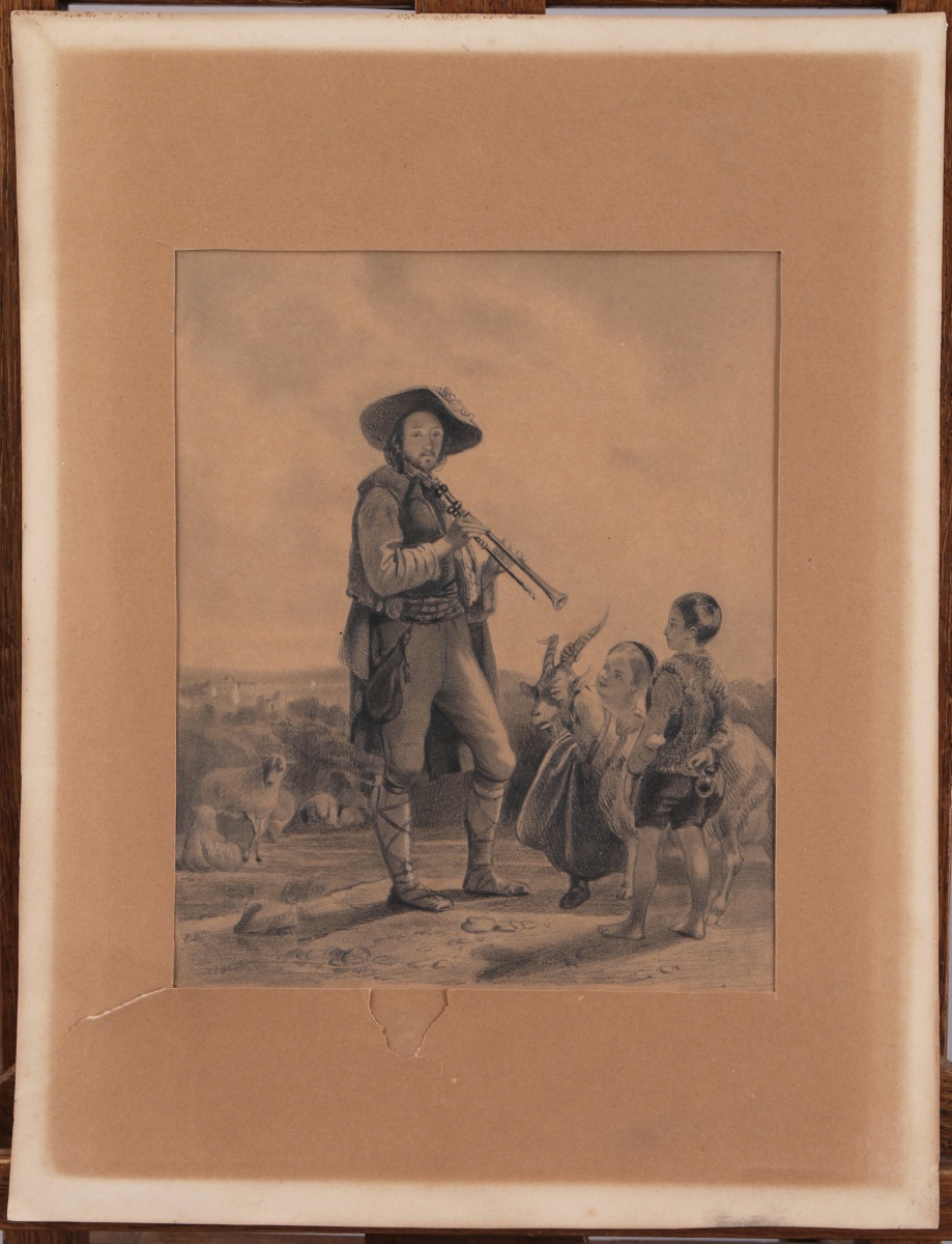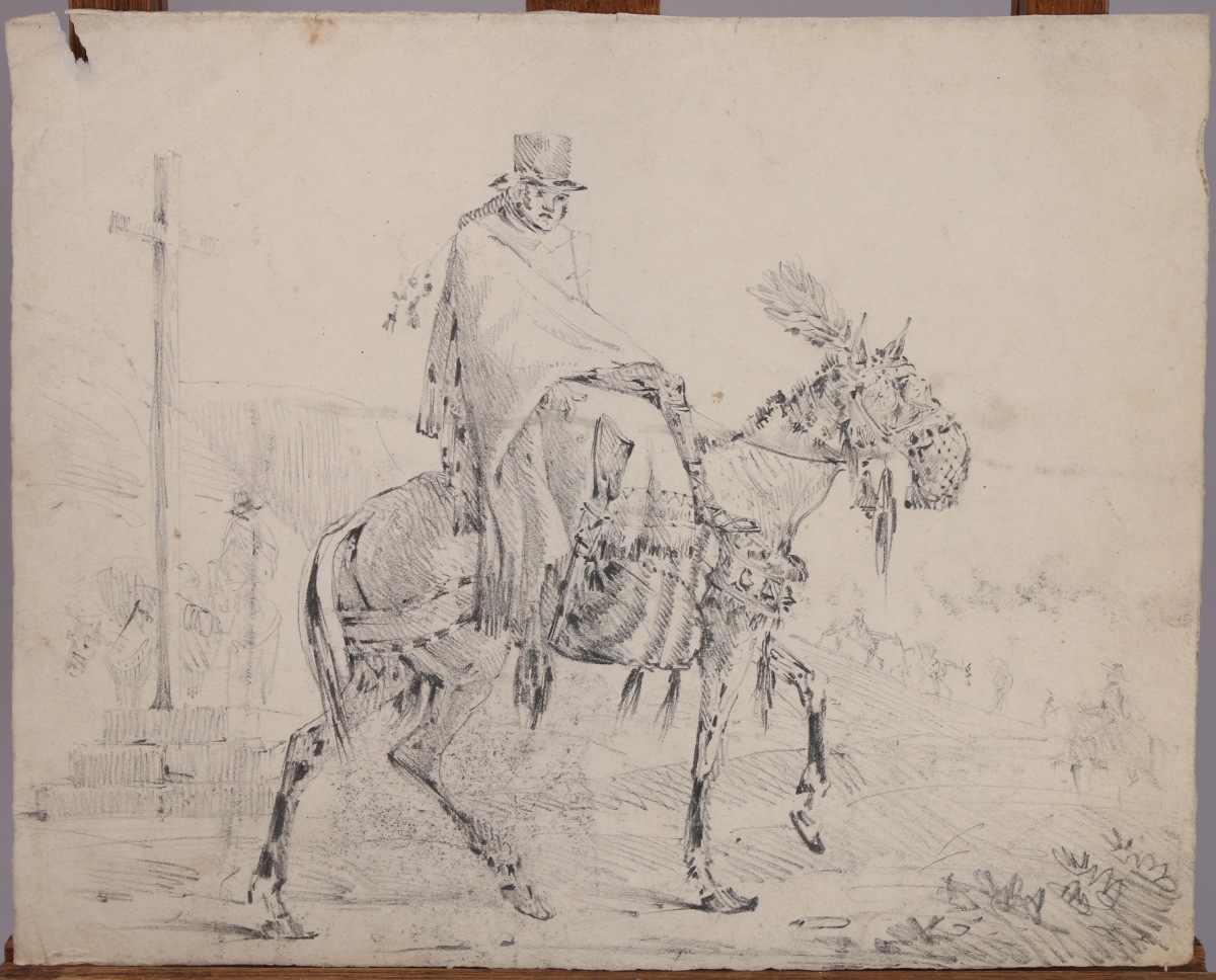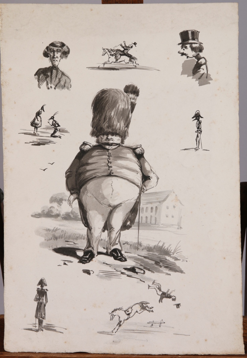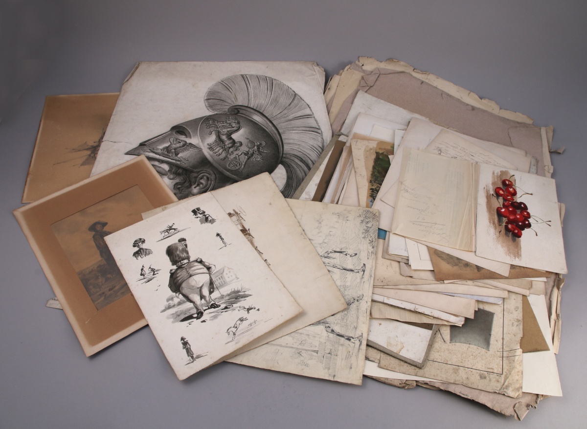Importante RÉUNION d'environ 70 DESSINS et AQUARELLES du XIXe siècle. Sujets divers : caricatures, paysages, marines, portraits, mythologie... À découvrir, en l'état.