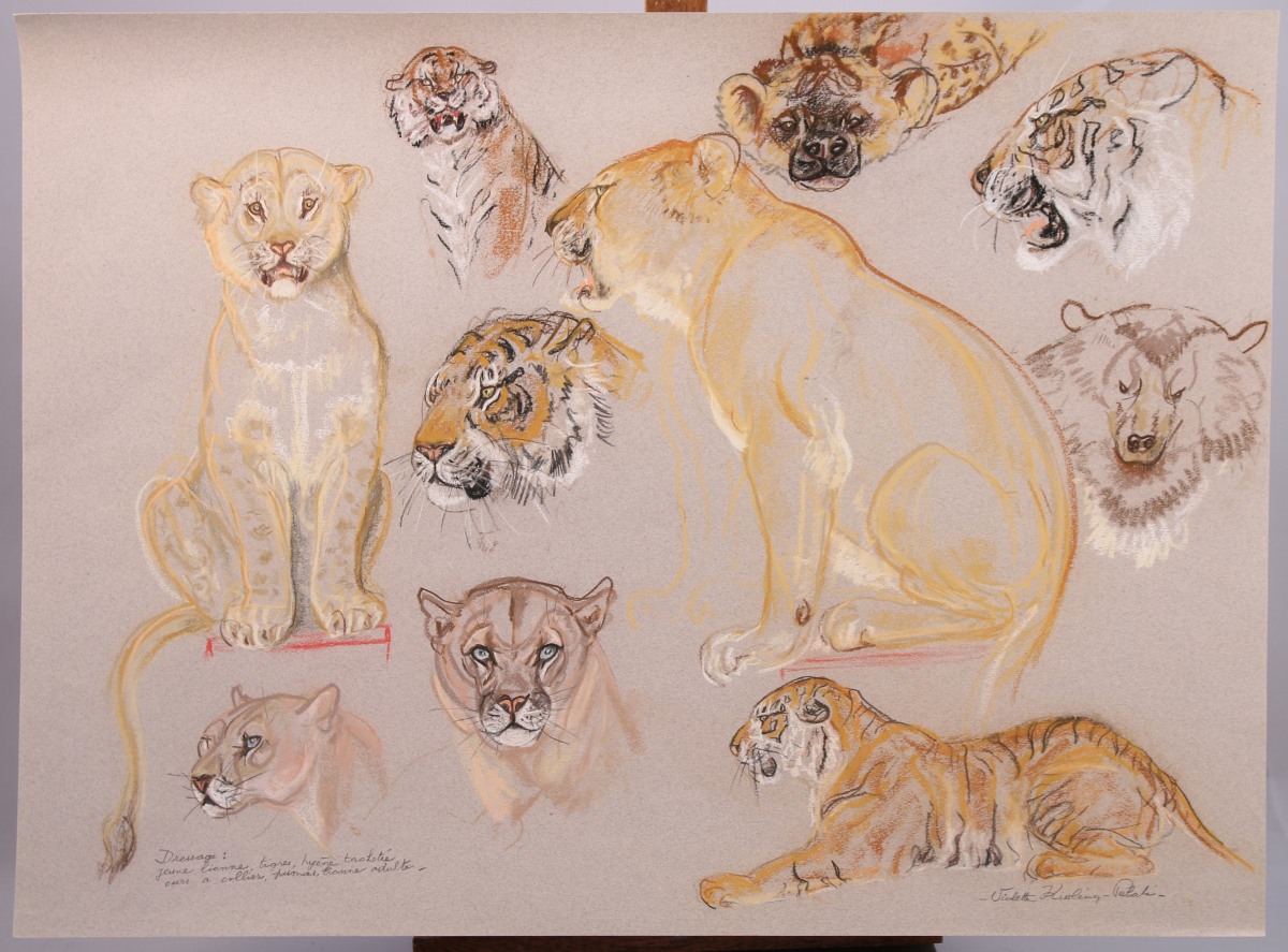 "Dressage : jeune lionne, hyène tachetée, ours à collier, pumas, lionne adulte."