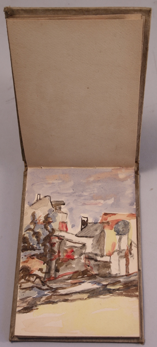 5 CARNETS DE NOTES avec deux aquarelles, dont un nu féminin dans l'un; plusieurs FEUILLES VOLANTES avec notes; CARTE DE VISITE, 3 PHOTOGRAPHIES de l'artiste; CARTON D'INVITATION à l'exposition blésoise de 1959; PLAQUETTE des tapisseries de Beauvais présentées à l'exposition des Galeries Lafayettes en 1933; DIPLÔME, médaille d'or de l'exposition des arts décoratifs de 1925; NOMINATION d'Officier d'Instruction publique de 1953; une GRAVURE; Sim, "le Tango", ALBUM, Sim, Tengoville sur mer, ALBUM; le CRAPOUILLOT, Noël 1926; GAZETTE DROUOT du 5 mai 1928; CATALOGUE de l'exposition Van Gogh de 1937; livre : MOURLE, de Gustave Kahm; LITHOGRAPHIE de la cathédrale de Strasbourg; LITHOGRAPHIE figurant un homme marchand; LITHOGRAPHIE Stébelska "les nouvelles de Verdun"; Henri RAMEY, Nu, lithographie signée en bas à droite et justifiée 20/75; portrait d'homme de profil, DESSIN signé Bria (?) et daté 28/5/39; homme au chapeau melon, DESSIN cubiste monogrammé SE; CARICATURE, homme au vélo, gouache; 2 SOUS-TASSES : l'une marquée "Tafine courant la prétrentaine nous nous sommes réfugiés au temple de l'art divin" un ange dessiné au centre; l'autre : A Rij-Rousseau loiseau mouche merci c'était délicieux" un visage dessiné au centre.