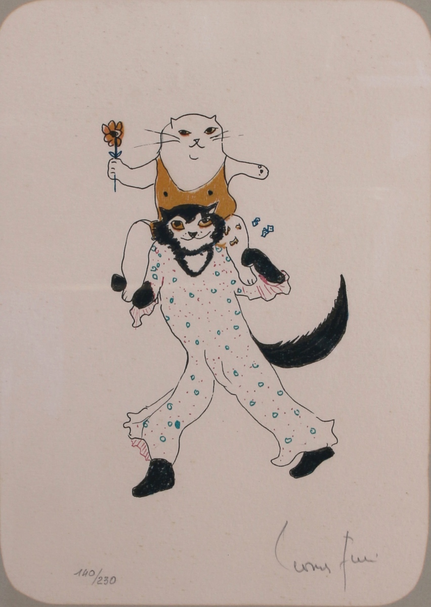 Gravure réhaussée en couleur, signée en bas à droite et numérotée 140/230 en bas à gauche.