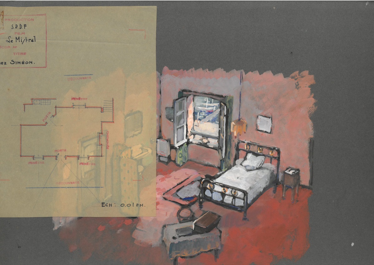 Lavis sur papier. 6 projets, joint calque avec cachet : Production SPDF Film "Le Mistal" Titre "Chez Siméon".