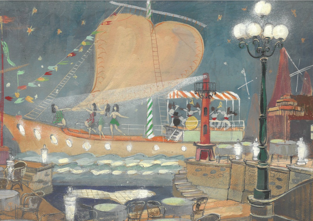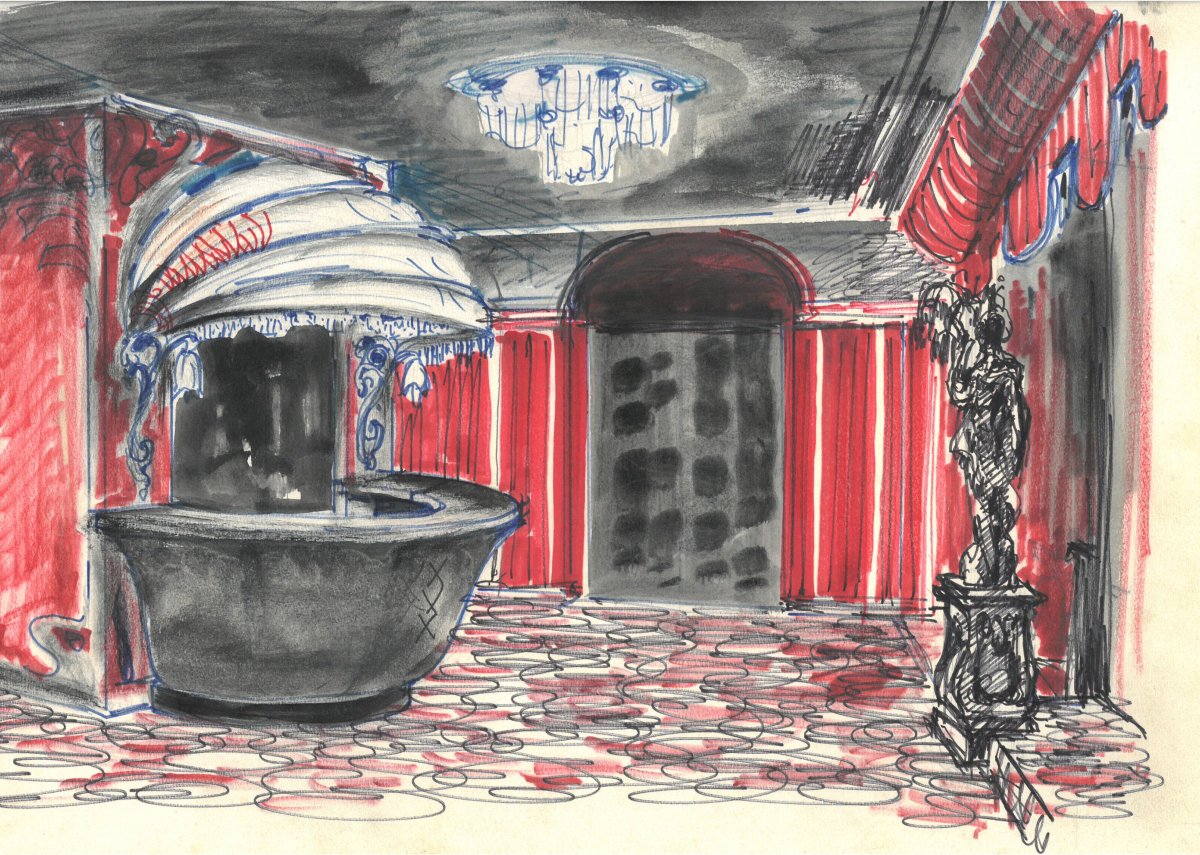 PROJETS DE DÉCOR. Ensemble comportant une cinquantaine de DOCUMENTS GRAPHIQUES : croquis, gouaches, aquarelles - projets de décors de films, de théatre, de restaurant, décors intérieurs...