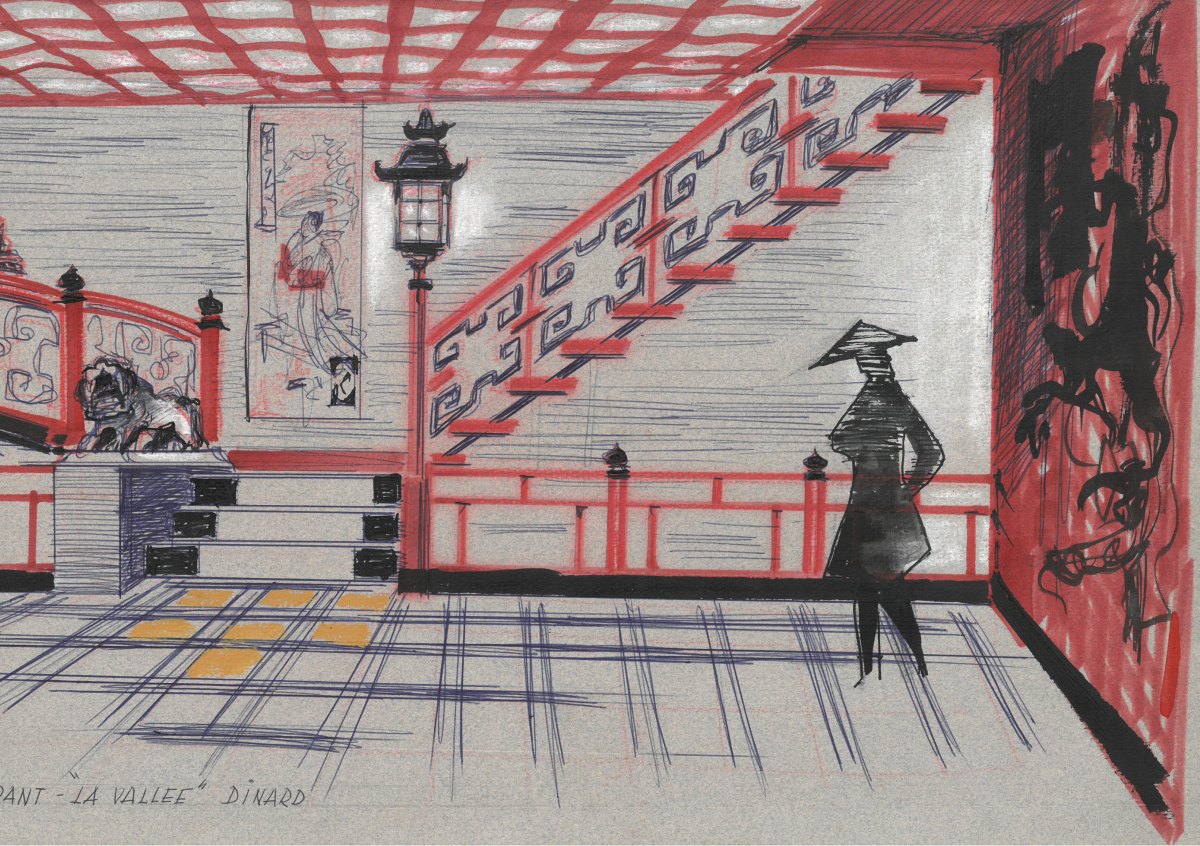 2 projets de décor pour "Hôtel Restaurant La Vallée - Mr et Me Vandenberg Pre - Dinard" : façade rue et entrée style Asie.