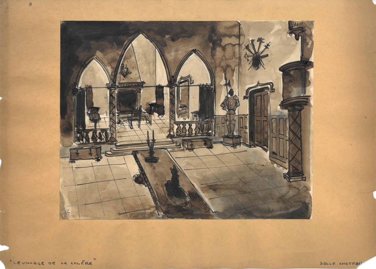 5 projets de décor pour "Le village de la colère" : "Boulangerie, Chambre chateau, Salle chateau, Chaumière, Auberge".