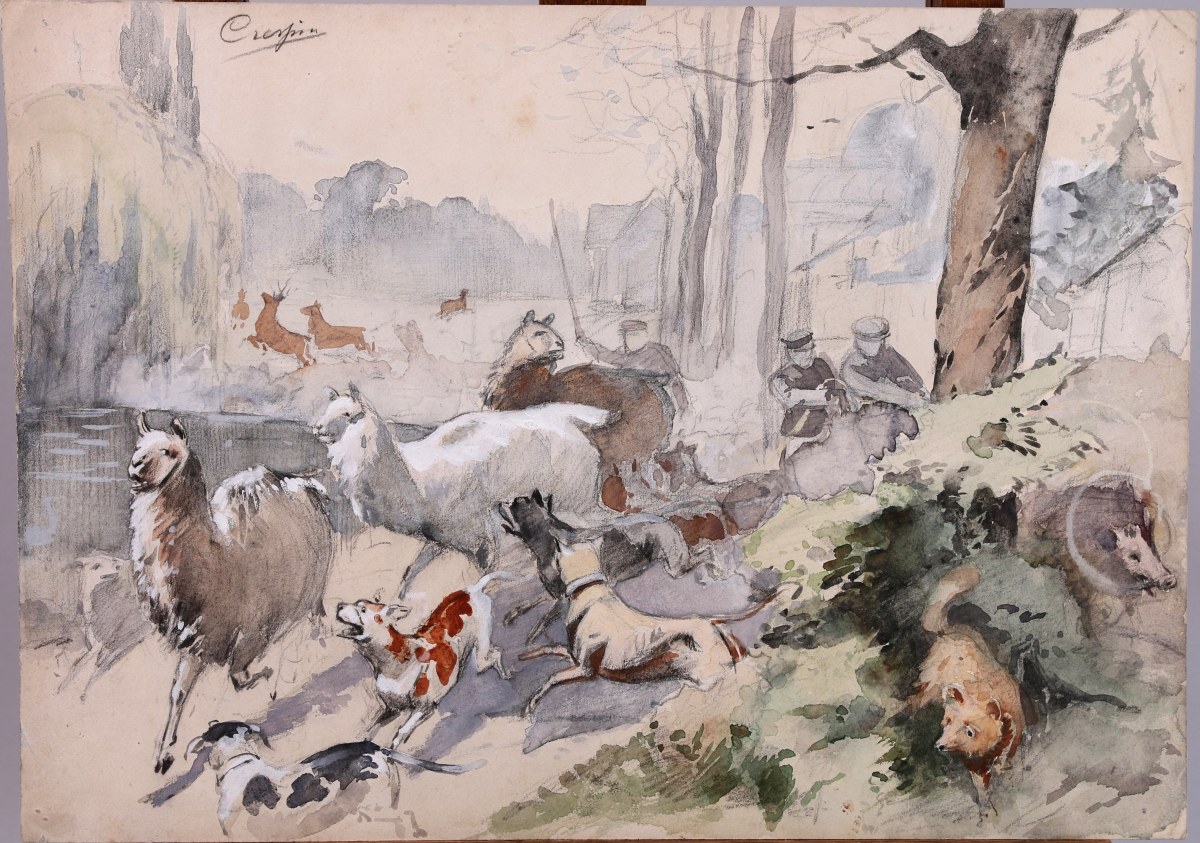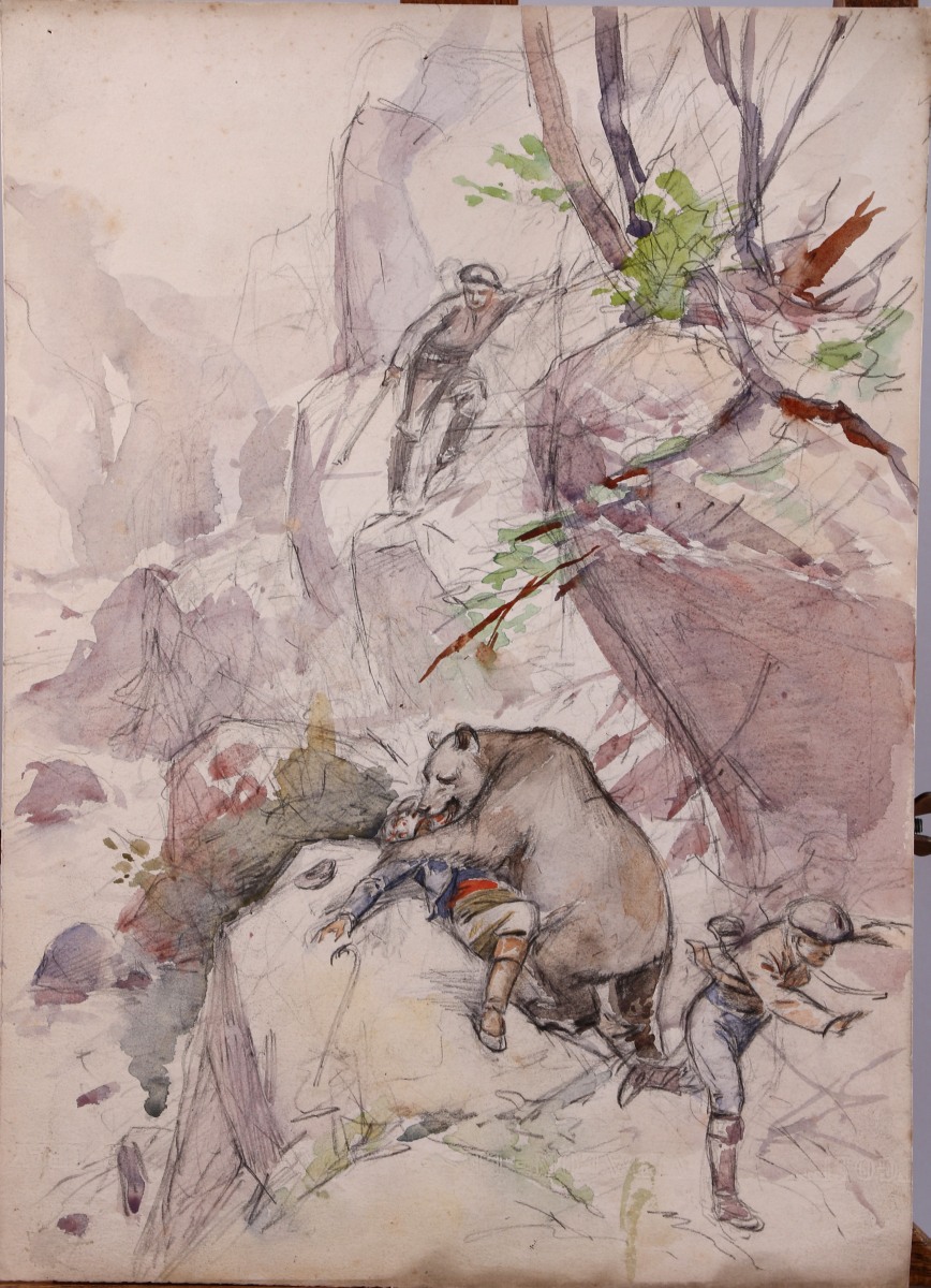 - École fin XIXe-début XXe. trois aquarelles gouachées. Chasseur attaqué par un ours; Chasse au lama et Éboulement sur un troupeau . 37 x 26,5 cm.