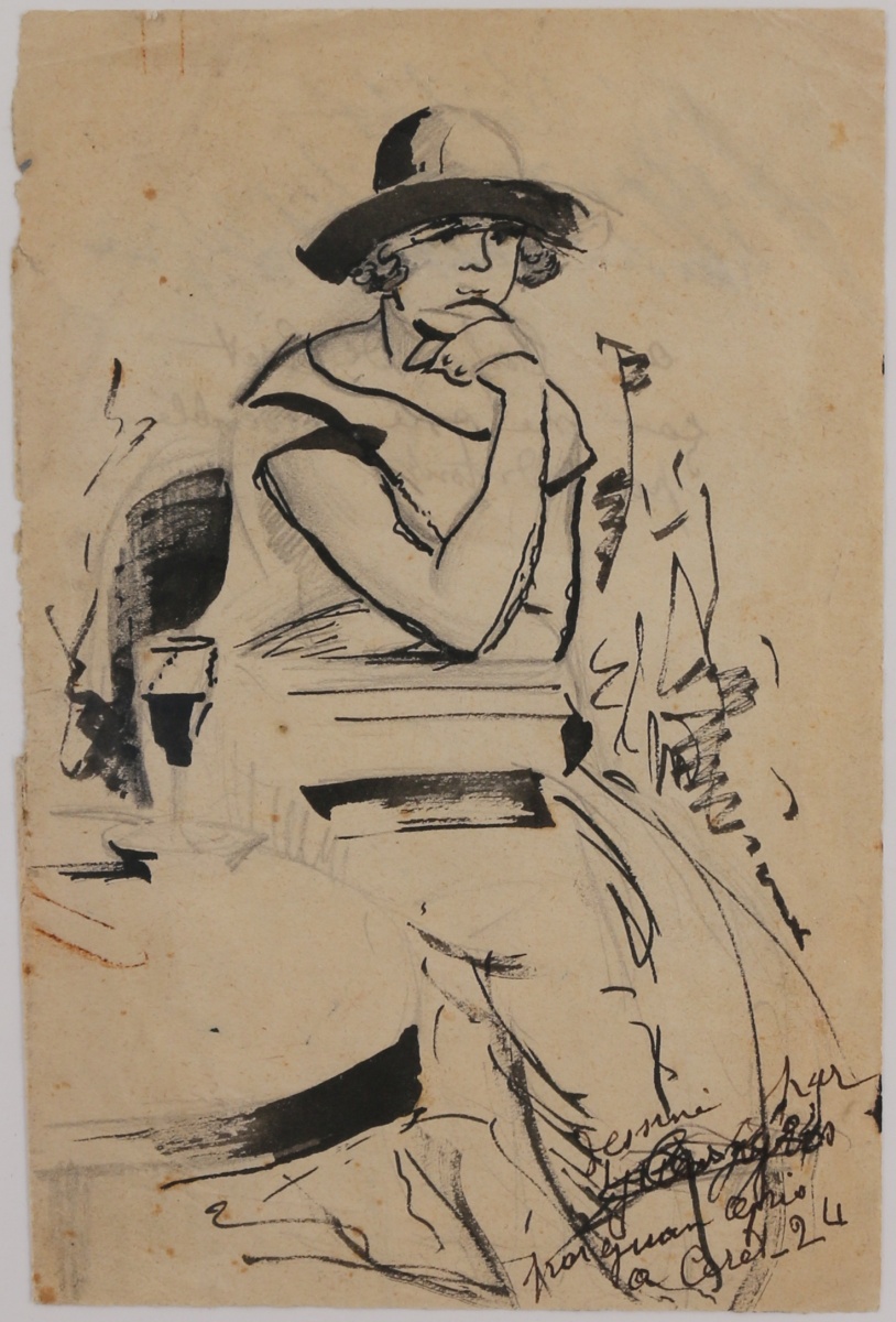 Inscription manuscrite à l'encre sur la feuille de la main de Rij-Rousseau : " dessiné par Juan Gris à Céret - 24 ".