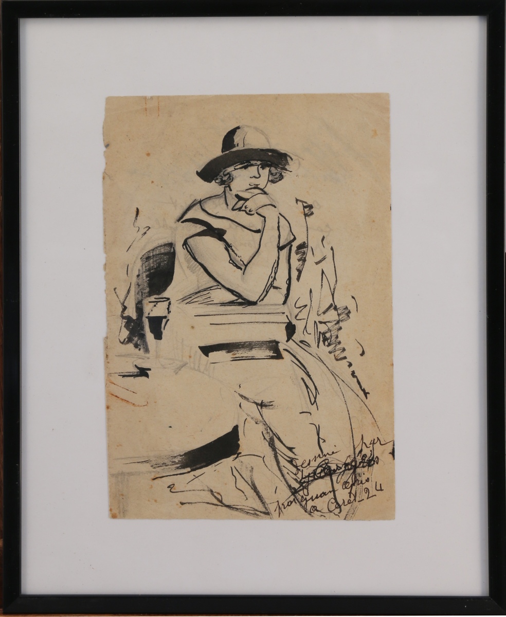 femme possessive et jalouse, griffonna sur cette encre, maculant la signature de Juan-Gris et rajouta cettez inscription, mélangeant les dates - écrivant au verso " au café de Céret ça ne me ressemble pas du tout " ! Elle fit de même pour un tableau toujours offert, mais par Léger "corrigeant " ce qui lui déplaisait...