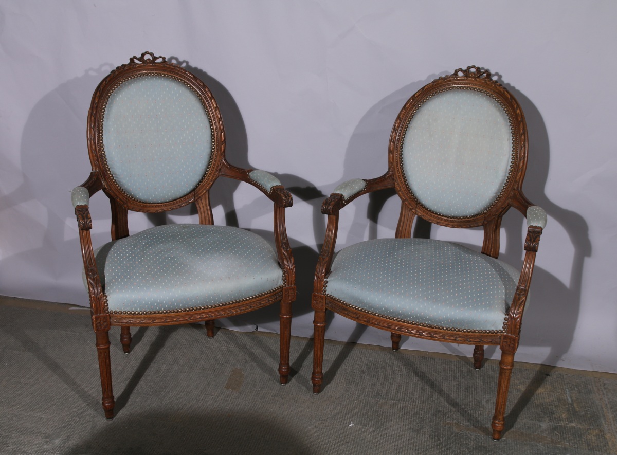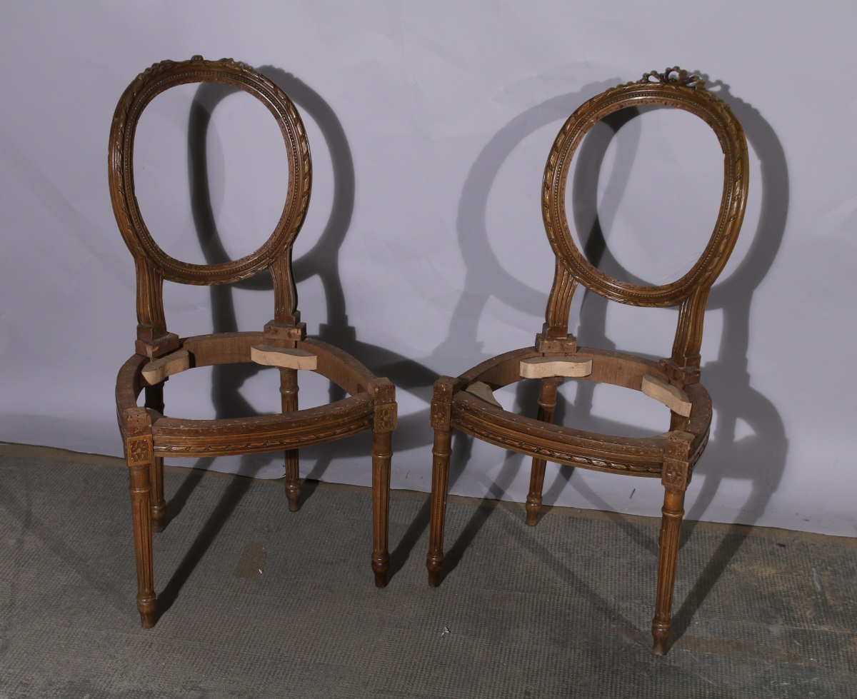 MOBILIER DE SALON, QUATRE PIÈCES, composé d'une paire de FAUTEUILS et d'une paire de BOIS de CHAISES à dossier médaillon en bois naturel mouluré et sculpté d'un riche répertoire de style néoclassique tel que cannelures, fleurons, frises rubanées, rais de perles et ruban noué. Reposent sur quatre pieds cannelés.