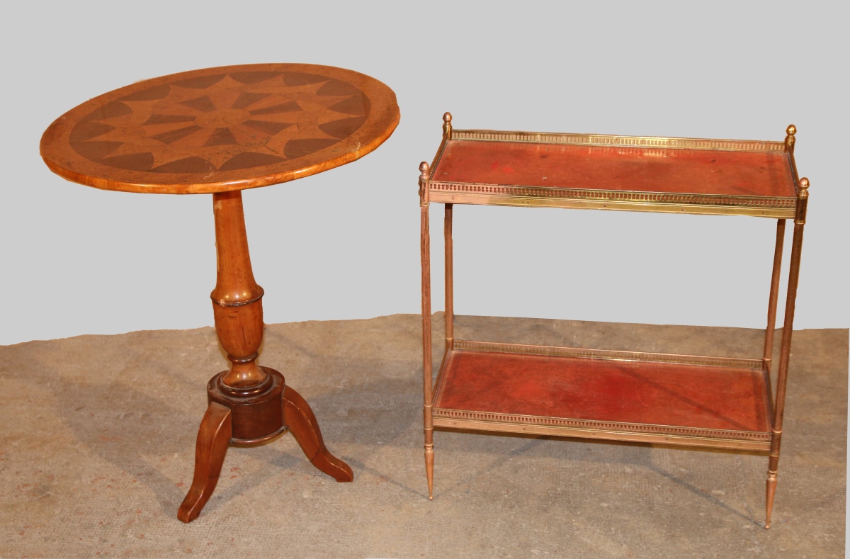 GUÉRIDON à plateau basculant de forme circulaire. Décor rayonnant en marqueterie d'acajou, acajou flammé, bois de citron et loupes. Fût balustre, piètement tripode.