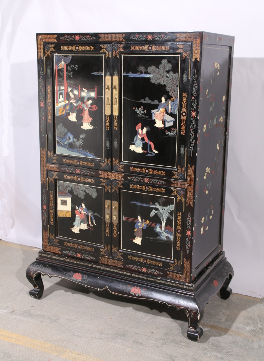 Petite ARMOIRE de forme rectangulaire en laque ouvrant en façade par quatre vantaux. Décor polychrome sur fond noir à l'imitation des productions de Coromandel. Elle repose sur un socle à quatre pieds cambrés.