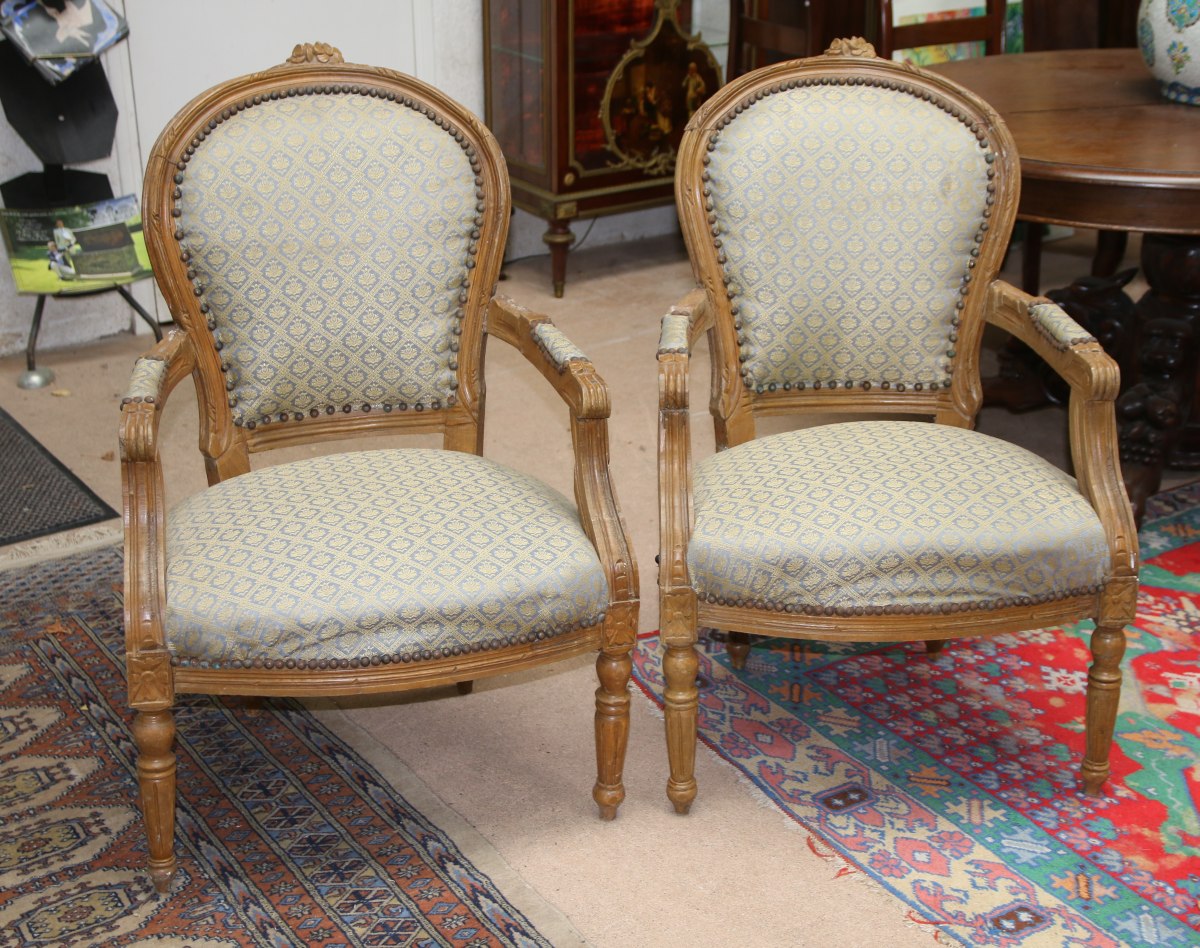 Paire de FAUTEUILS cabriolets en bois naturel mouluré et sculpté de joncs rubannés, fleurons et de fleurettes à l'amortissement du dossier. Ils reposent sur quatre pieds tournés ornés de cannelures.